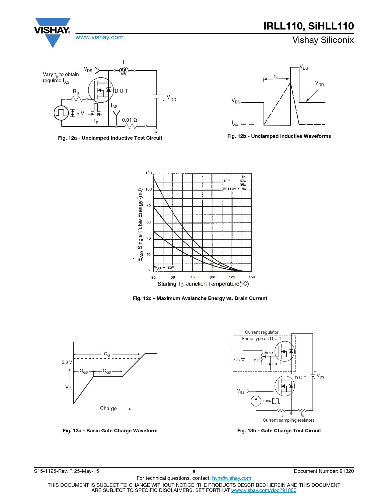 IRLL110, SiHLL110 www.vishay.com Vishay Siliconix L V VDS DS Vary tp to obtain tp required IAS VDD R D.U.T g + V - DD VDS IAS 5 V t 0.01 p Ω IAS Fig. 12a - Unclamped Inductive Test CircuitFig. 12b - Unclamped Inductive WaveformsFig. 12c - Maximum Avalanche Energy vs. Drain Current Current regulator Same type as D.U.T. Q 50 kΩ G 12 V 0.2 µF 5.0 V 0.3 µF Q Q GS GD + V D.U.T. DS - VG VGS 3 mA Charge I I G D Current sampling resistors Fig. 13a - Basic Gate Charge WaveformFig. 13b - Gate Charge Test Circuit S15-1195-Rev. F, 25-May-15 6 Document Number: 91320 For technical questions, contact: hvm@vishay.com THIS DOCUMENT IS SUBJECT TO CHANGE WITHOUT NOTICE. THE PRODUCTS DESCRIBED HEREIN AND THIS DOCUMENT ARE SUBJECT TO SPECIFIC DISCLAIMERS, SET FORTH AT www.vishay.com/doc?91000