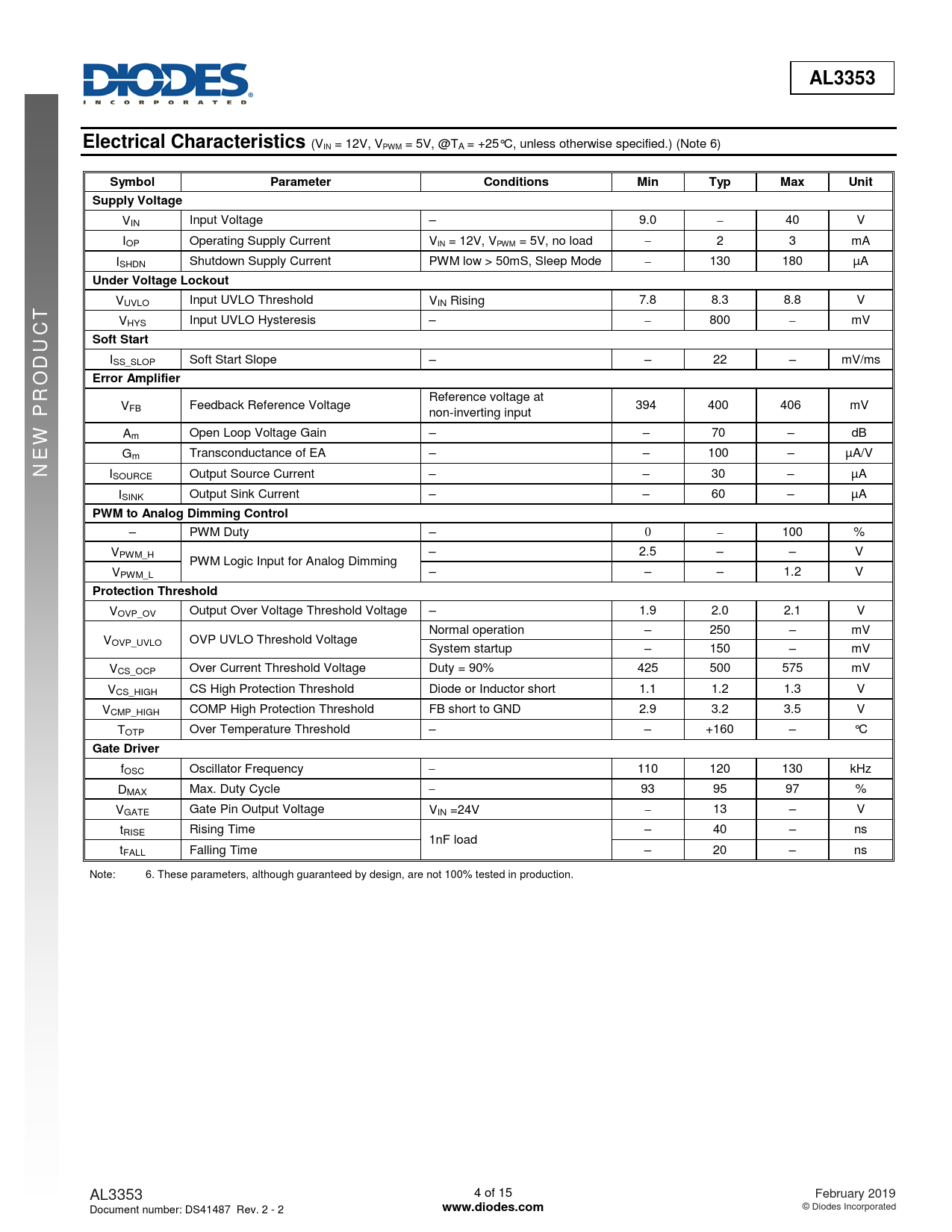 AL3353. Electrical Characteristics. Symbol. Parameter. Conditions. Min. Typ. Max. Unit. Supply Voltage. Under Voltage Lockout. Soft Start