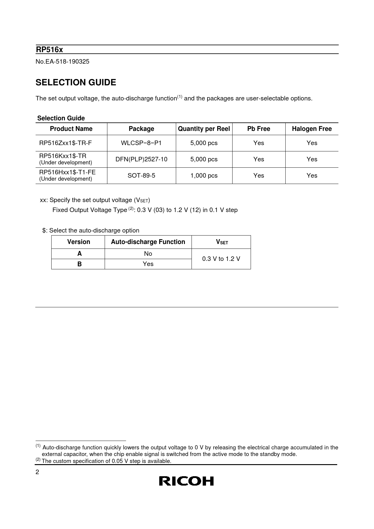 RP516x. SELECTION GUIDE. Selection Guide. Product Name. Package. Quantity per Reel. Pb Free. Halogen Free. Version