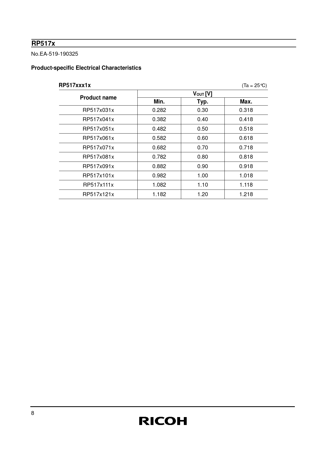 | 页数 / 页 | 29 / 8 — RP517x. Product-specific Electrical Characteristics. RP517xxx1x. VOUT … |