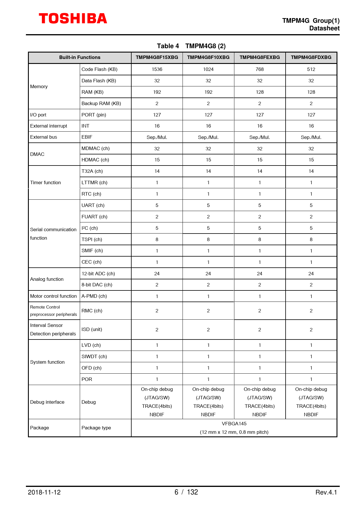 TMPM4G Group(1). Datasheet. Table 4 TMPM4G8 (2). Built-in Functions. TMPM4G8F15XBG. TMPM4G8F10XBG. TMPM4G8FEXBG. TMPM4G8FDXBG