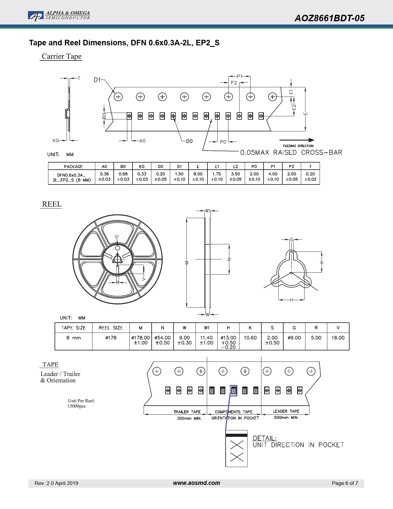 | 页数 / 页 | 7 / 6 — AOZ8661BDT-05. Tape and Reel Dimensions, DFN 0.6x0.3A-2L, EP2_S. … |