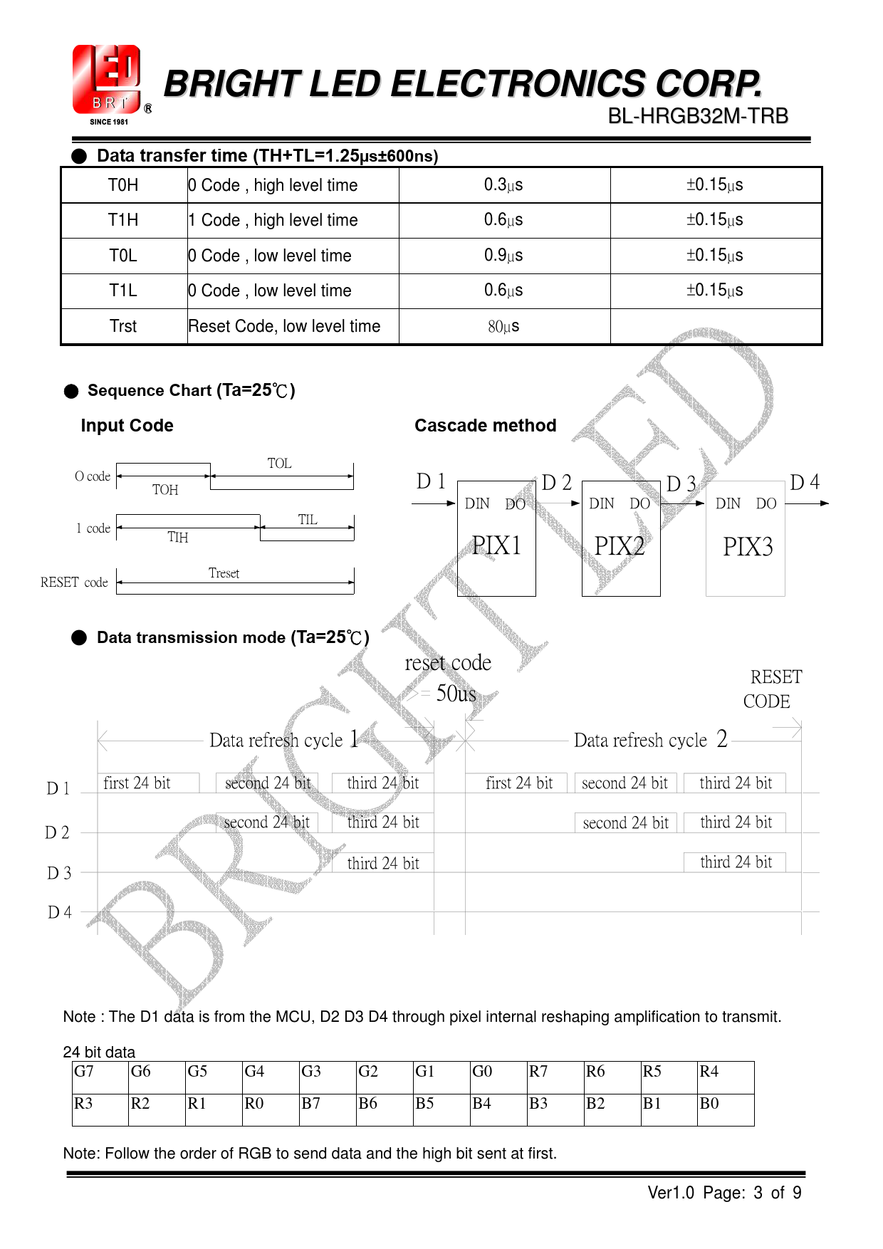 BRIGHT LED ELECTRONICS CORP. Data transfer time (TH+TL=1.25µs±600ns). Sequence Chart (Ta=25. Input Code Cascade method