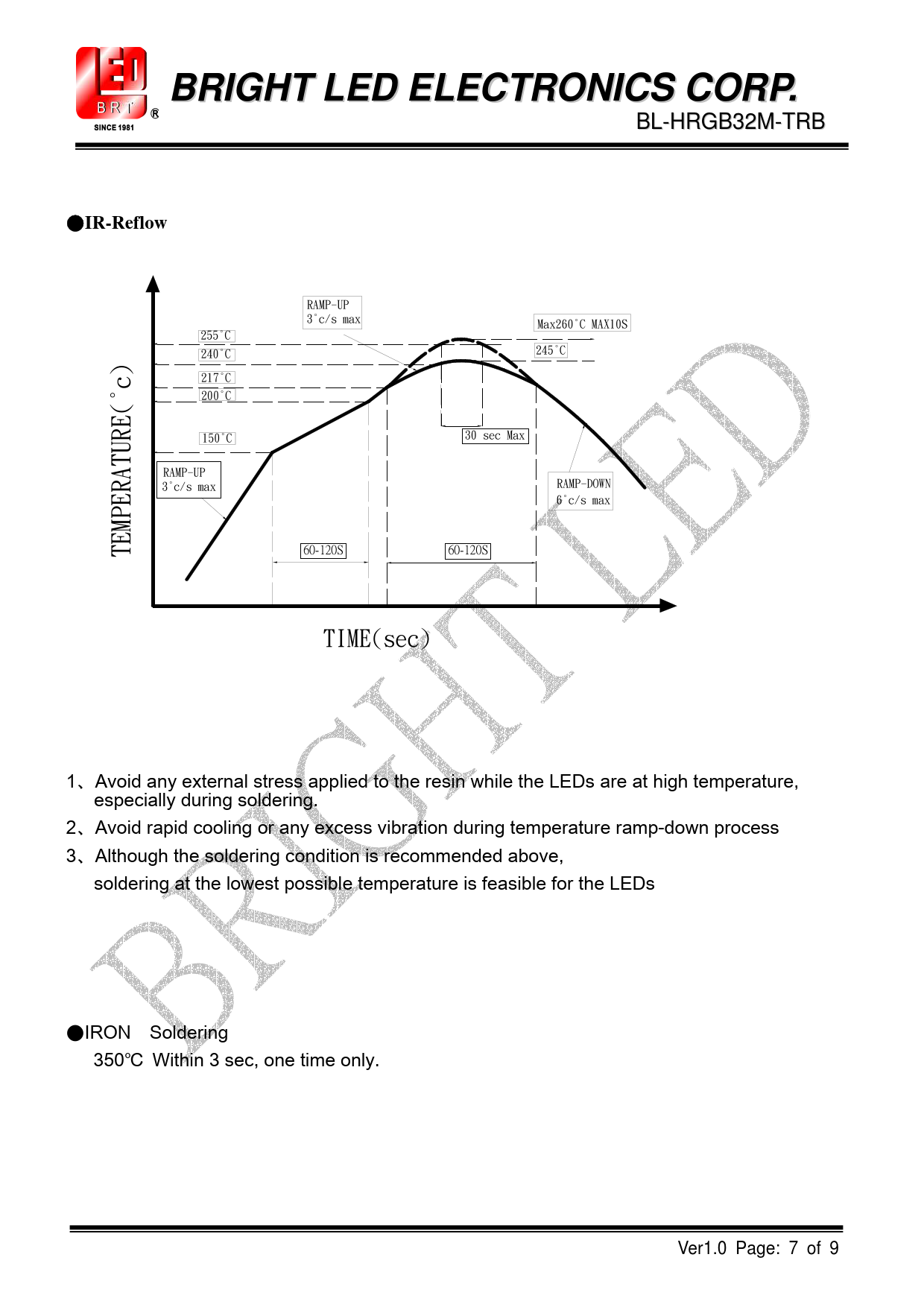 BRIGHT LED ELECTRONICS CORP. BL-HRGB32M-TRB ● IR-Reflow RAMP-UP 3°c/s max Max260°C MAX10S 255°C 240°C 245°C 217°C 200°C 150°C 30 sec Max RAMP-UP 3°c/s max RAMP-DOWN 6°c/s max TEMPERATURE(°c) 60-120S 60-120S TIME(sec) 1、Avoid any external stress applied to the resin while the LEDs are at high temperature, especially during soldering. 2、Avoid rapid cooling or any excess vibration during temperature ramp-down process 3、Although the soldering condition is recommended above, soldering at the lowest possible temperature is feasible for the LEDs ●IRON Soldering 350℃ Within 3 sec, one time only. Ver1.0 Page: 7 of 9