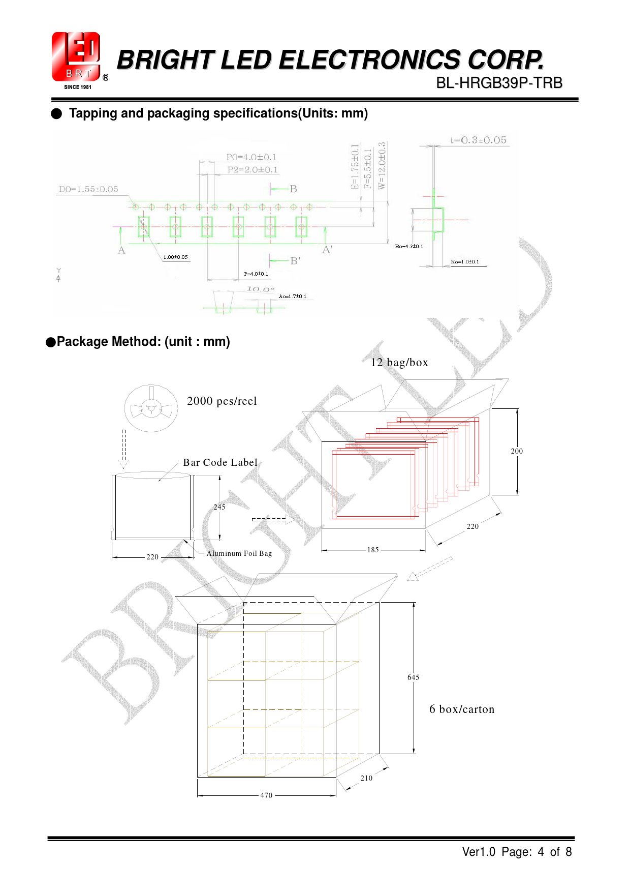 | 页数 / 页 | 8 / 4 — BRIGHT LED ELECTRONICS CORP. Tapping and packaging specifications(Units: … |