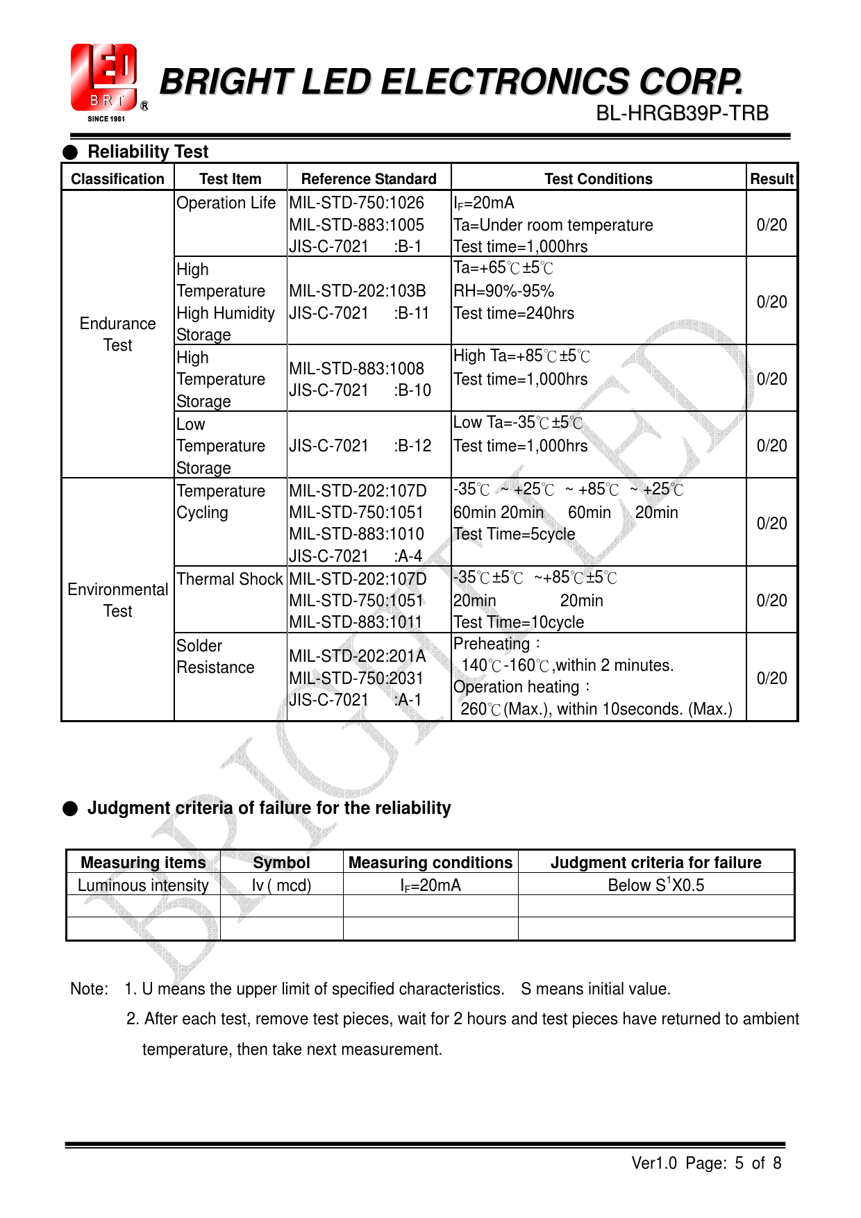 页数 / 页8 / 5 — BRIGHT LED ELECTRONICS CORP. Reliability Test. Classification. Test Item. …