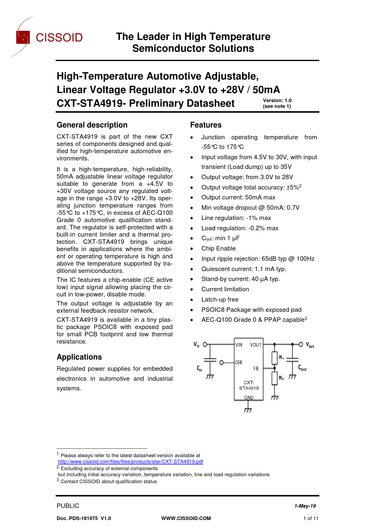 The Leader in High Temperature Semiconductor Solutions High-Temperature Automotive Adjustable, Linear Voltage Regulator +3.0V to +28V / 50mA CXT-STA4919- Preliminary Datasheet Version: 1.0 (see note 1) General description Features