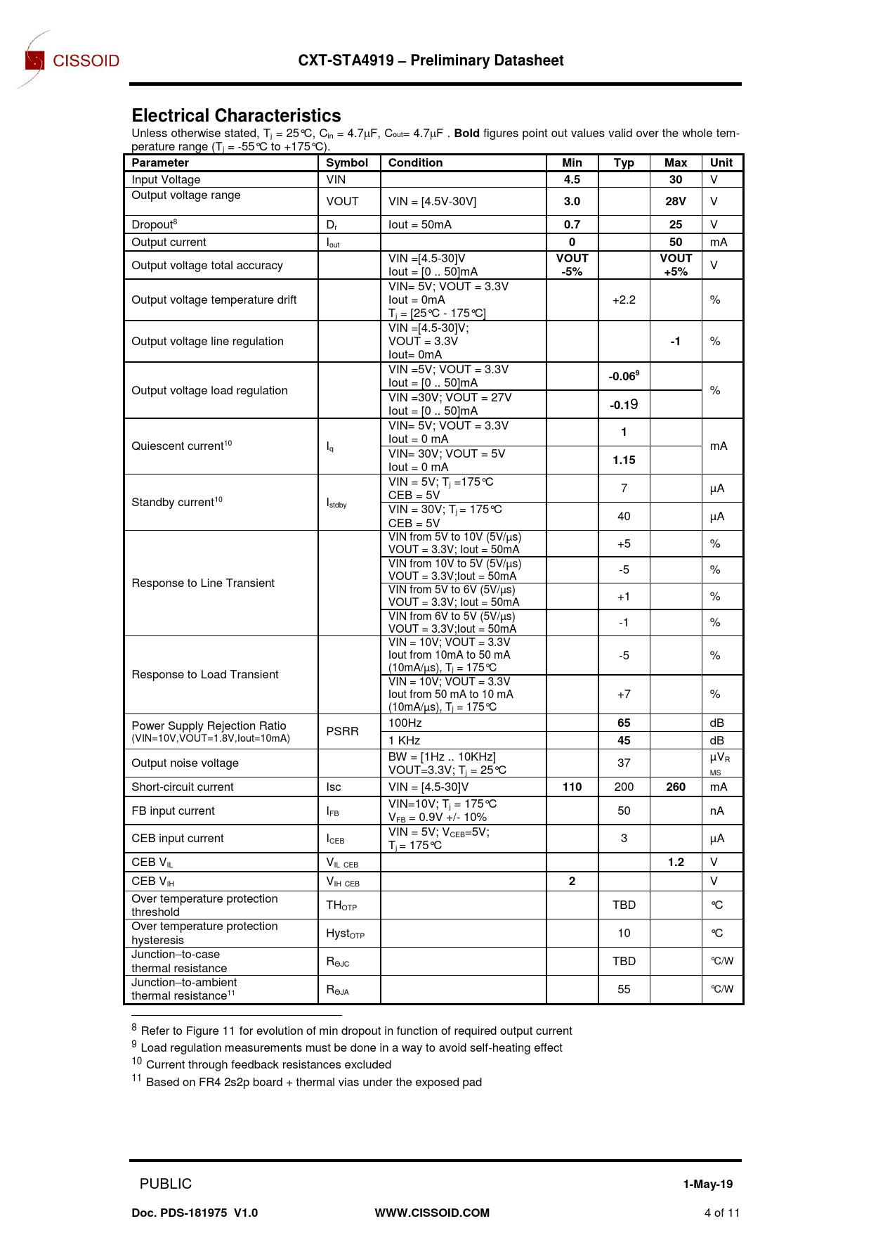 link to page 4 link to page 4 link to page 6 CXT-STA4919 – Preliminary DatasheetElectrical Characteristics Unless otherwise stated, Tj = 25°C, Cin = 4.7F, Cout= 4.7F . Bold figures point out values valid over the whole tem- perature range (Tj = -55°C to +175°C). ParameterSymbolConditionMinTypMaxUnit Input Voltage VIN 4.530 V Output voltage range VOUT VIN = [4.5V-30V] 3.028V V Dropout8 Dr Iout = 50mA 0.725 V Output current Iout 050 mA VIN =[4.5-30]V VOUTVOUT Output voltage total accuracy V Iout = [0 .. 50]mA -5%+5% VIN= 5V; VOUT = 3.3V Output voltage temperature drift Iout = 0mA +2.2 % Tj = [25°C - 175°C] VIN =[4.5-30]V; Output voltage line regulation VOUT = 3.3V -1 % Iout= 0mA VIN =5V; VOUT = 3.3V -0.069 Iout = [0 .. 50]mA Output voltage load regulation % VIN =30V; VOUT = 27V -0.1 9 Iout = [0 .. 50]mA VIN= 5V; VOUT = 3.3V 1 Iout = 0 mA Quiescent current10 Iq mA VIN= 30V; VOUT = 5V 1.15 Iout = 0 mA VIN = 5V; Tj =175°C 7 µA CEB = 5V Standby current10 Istdby VIN = 30V; Tj = 175°C 40 µA CEB = 5V VIN from 5V to 10V (5V/µs) +5 % VOUT = 3.3V; Iout = 50mA VIN from 10V to 5V (5V/µs) -5 % VOUT = 3.3V;Iout = 50mA Response to Line Transient VIN from 5V to 6V (5V/µs) +1 % VOUT = 3.3V; Iout = 50mA VIN from 6V to 5V (5V/µs) -1 % VOUT = 3.3V;Iout = 50mA VIN = 10V; VOUT = 3.3V Iout from 10mA to 50 mA -5 % (10mA/µs), T Response to Load Transient j = 175°C VIN = 10V; VOUT = 3.3V Iout from 50 mA to 10 mA +7 % (10mA/µs), Tj = 175°C Power Supply Rejection Ratio 100Hz 65 dB PSRR (VIN=10V,VOUT=1.8V,Iout=10mA) 1 KHz 45 dB BW = [1Hz .. 10KHz] µV Output noise voltage 37 R VOUT=3.3V; Tj = 25°C MS Short-circuit current Isc VIN = [4.5-30]V 110 200 260 mA VIN=10V; T FB input current I j = 175°C FB 50 nA VFB = 0.9V +/- 10% VIN = 5V; V CEB input current I CEB=5V; CEB 3 µA Tj = 175°C CEB VIL VIL CEB 1.2 V CEB VIH VIH CEB 2 V Over temperature protection TH threshold OTP TBD °C Over temperature protection Hyst hysteresis OTP 10 °C Junction–to-case R thermal resistance ΘJC TBD °C/W Junction–to-ambient R thermal resistance11 ΘJA 55 °C/W 8 Refer to Figure 11 for evolution of min dropout in function of required output current 9 Load regulation measurements must be done in a way to avoid self-heating effect 10 Current through feedback resistances excluded 11 Based on FR4 2s2p board + thermal vias under the exposed pad PUBLIC 1-May-19Doc. PDS-181975 V1.0WWW.CISSOID.COM 4 of 11