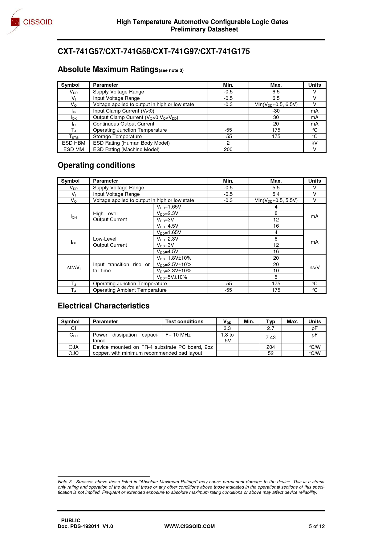 May. 19 High Temperature Automotive Configurable Logic Gates Preliminary Datasheet CXT-741G57/CXT-741G58/CXT-741G97/CXT-741G175 Absolute Maximum Ratings(see note 3) Symbol Parameter Min. Max. Units