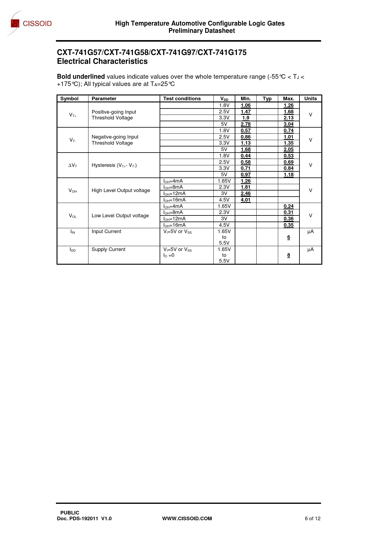 Contact : Gonzalo Picún (+32-10-489214) May. 19High Temperature Automotive Configurable Logic GatesPreliminary DatasheetCXT-741G57/CXT-741G58/CXT-741G97/CXT-741G175 Electrical Characteristics Bold underlined values indicate values over the whole temperature range (-55°C < TJ < +175°C); All typical values are at TA=25°C SymbolParameterTest conditionsVDDMin.TypMax.Units 1.8V 1.061.26 Positive-going Input 2.5V 1.471.68 VT+ V Threshold Voltage 3.3V 1.92.13 5V 2.783.04 1.8V 0.570.74 Negative-going Input 2.5V 0.861.01 VT- V Threshold Voltage 3.3V 1.131.35 5V 1.682.05 1.8V 0.440.53 Δ 2.5V 0.580.69 VT Hysteresis (VT+- VT-) V 3.3V 0.710.84 5V 0.971.18 IOH=4mA 1.65V 1.26 I V OH=8mA 2.3V 1.81 OH High Level Output voltage V IOH=12mA 3V 2.46 IOH=16mA 4.5V 4.01 IOH=4mA 1.65V 0.24 I V OH=8mA 2.3V 0.31 OL Low Level Output voltage V IOH=12mA 3V 0.36 IOH=16mA 4.5V 0.35 IIN Input Current VI=5V or VSS 1.65V µA to 6 5.5V IDD Supply Current VI=5V or VSS 1.65V µA IO =0 to 8 5.5V PUBLICDoc. PDS-192011 V1.0WWW.CISSOID.COM 6 of 12
