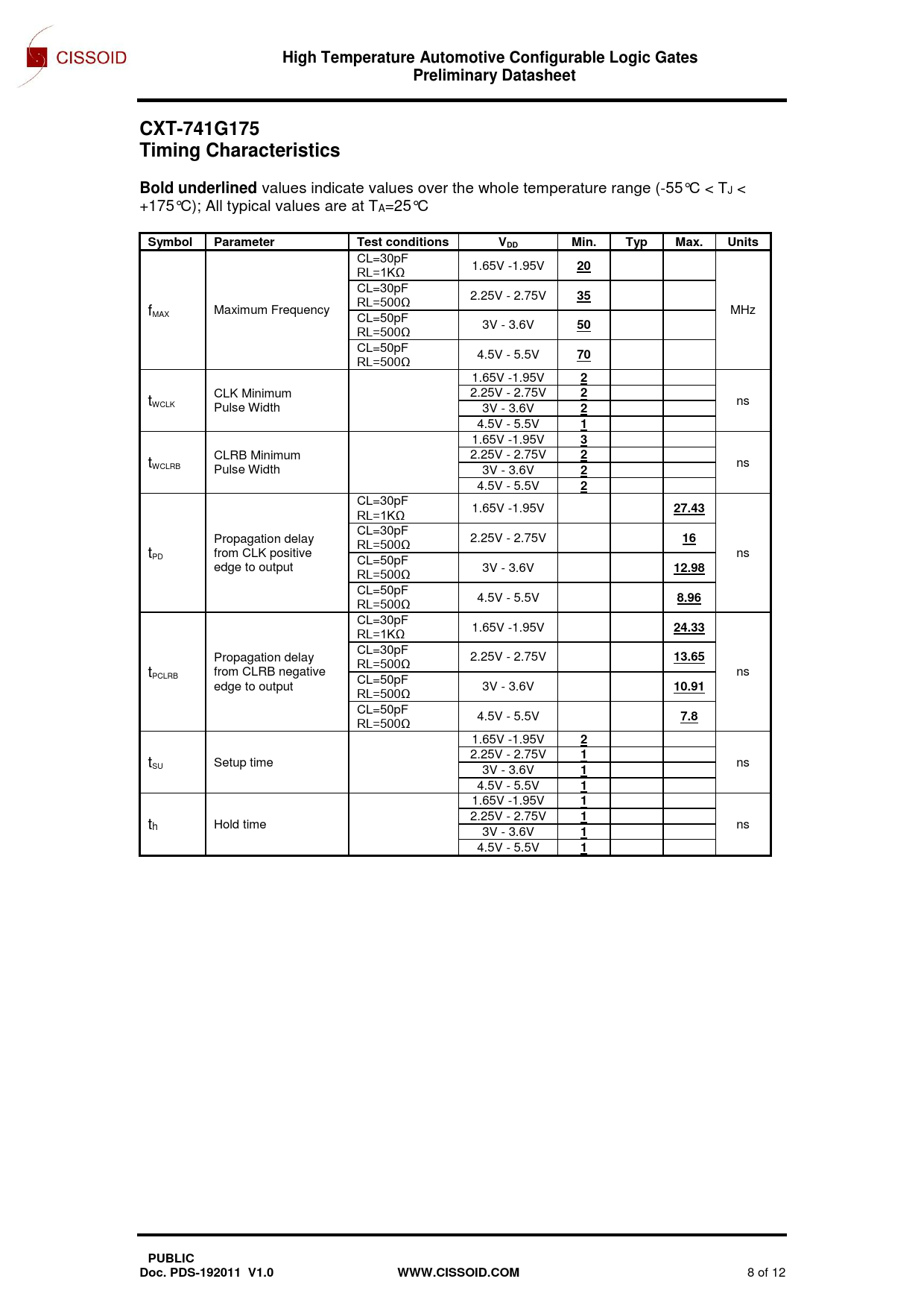 May. 19. High Temperature Automotive Configurable Logic Gates. Preliminary Datasheet. CXT-741G175 Timing Characteristics