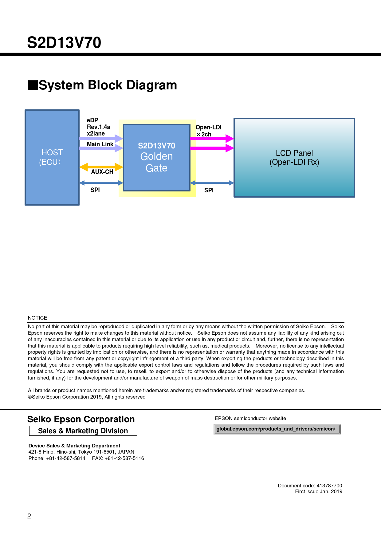 S2D13V70 System Block Diagram eDP Rev.1.4a Open-LDI x2lane 2ch Main Link AUX-CH SPI Seiko Epson Corporation