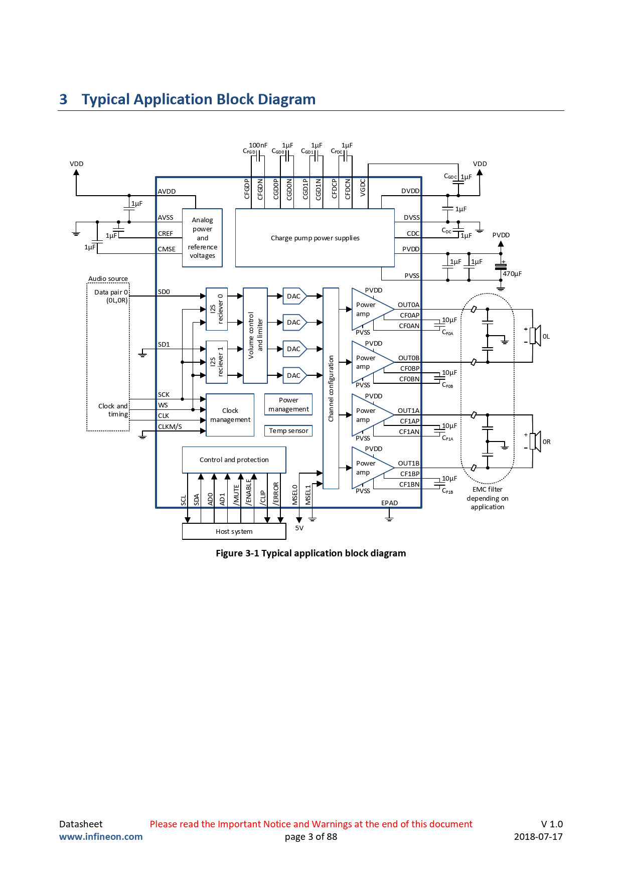 100nF 1µF 1µF 1µF CFGD CGD0 CGD1 CFDC VDD VDD C P GDC N P 1µF D 0P N C D 0N 1P 1N C C AVDD G D D D FG G D G D FD DVDD CF C C G G VGD C C C CF C 1µF 1µF AVSS DVSS Analog power CREF C 1µF CDC DC 1µF PVDD and Charge pump power supplies 1µF CMSE reference PVDD voltages + 1µF 1µF PVSS 470µF Audio source Data pair 0 SD0 PVDD 0 DAC (0L,0R) r Power OUT0A I2S eve l amp CF0AP ro 10µF reci nt DAC iter CF0AN co PVSS CF0A e 0L SD1 m d lim PVDD 1 u an DAC r Vol Power OUT0B ion I2S amp cieve CF0BP rat 10µF re DAC CF0BN figu n PVSS CF0B SCK l co PVDD Power Clock and WS ne Clock management Power OUT1A timing CLK management han C amp CF1AP CLKM/S 10µF Temp sensor CF1AN PVSS CF1A 0R PVDD Control and protection Power OUT1B amp CF1BP 10µF E E R CF1BN BL O L0 L1 C EMC filter PVSS L A 0 1 UT F1B LIP SE SE D D depending on SC SD A A /M /ENA /C /ERR M M EPAD application Host system 5V