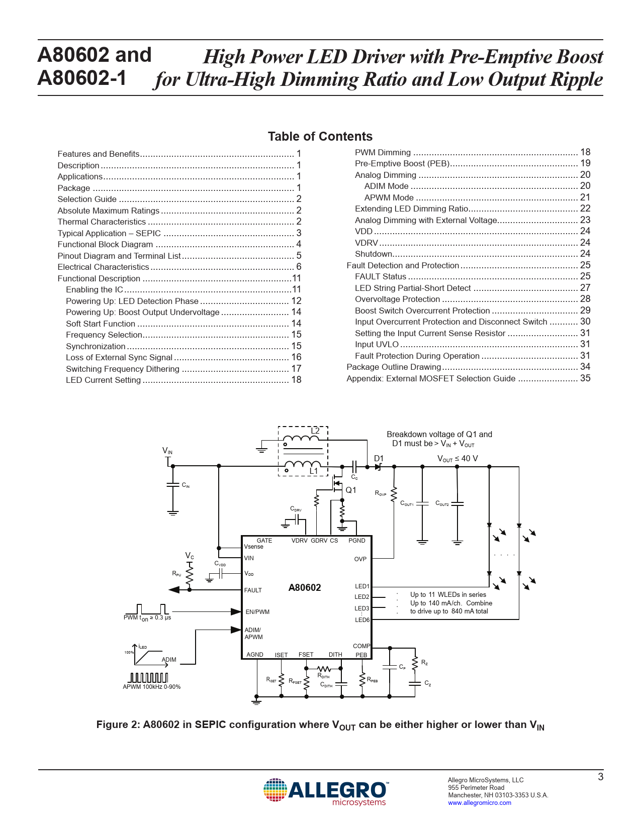 link to page 1 link to page 1 link to page 1 link to page 1 link to page 2 link to page 2 link to page 2 link to page 3 link to page 4 link to page 5 link to page 6 link to page 11 link to page 11 link to page 12 link to page 14 link to page 14 link to page 15 link to page 15 link to page 16 link to page 17 link to page 18 link to page 18 link to page 19 link to page 20 link to page 20 link to page 21 link to page 22 link to page 23 link to page 24 link to page 24 link to page 24 link to page 25 link to page 25 link to page 27 link to page 28 link to page 29 link to page 30 link to page 31 link to page 31 link to page 31 link to page 34 link to page 35 A80602 andHigh Power LED Driver with Pre-Emptive BoostA80602-1 for Ultra-High Dimming Ratio and Low Output RippleTable of Contents Features and Benefits ... 1 PWM Dimming ... 18 Description .. 1 Pre-Emptive Boost (PEB) ... 19 Applications ... 1 Analog Dimming ... 20 Package ... 1 ADIM Mode .. 20 Selection Guide ... 2 APWM Mode .. 21 Absolute Maximum Ratings ... 2 Extending LED Dimming Ratio.. 22 Thermal Characteristics .. 2 Analog Dimming with External Voltage... 23 Typical Application – SEPIC .. 3 VDD .. 24 Functional Block Diagram ... 4 VDRV .. 24 Pinout Diagram and Terminal List ... 5 Shutdown... 24 Electrical Characteristics ... 6 Fault Detection and Protection ... 25 Functional Description ...11 FAULT Status ... 25 Enabling the IC ..11 LED String Partial-Short Detect .. 27 Powering Up: LED Detection Phase .. 12 Overvoltage Protection .. 28 Powering Up: Boost Output Undervoltage .. 14 Boost Switch Overcurrent Protection ... 29 Soft Start Function .. 14 Input Overcurrent Protection and Disconnect Switch ... 30 Frequency Selection .. 15 Setting the Input Current Sense Resistor ... 31 Synchronization .. 15 Input UVLO .. 31 Loss of External Sync Signal .. 16 Fault Protection During Operation ... 31 Switching Frequency Dithering ... 17 Package Outline Drawing .. 34 LED Current Setting .. 18 Appendix: External MOSFET Selection Guide ... 35 L2 Breakdown voltage of Q1 and D1 must be > V V IN + VOUT IN D1 VOUT ≤ 40 V L1 CC CIN Q1 ROVP C C OUT1 COUT2 DRV GATE VDRV GDRV CS PGND Vsense VC VIN OVP CVDD RPU VDD LED1 FAULT A80602 LED2 Up to 11 WLEDs in series Up to 140 mA/ch. Combine LED ... 3 EN/PWM to drive up to 840 mA total PWM ton ≥ 0.3 µs LED6 ADIM/ APWM iLED COMP 100% AGND ISET FSET DITH PEB ADIM RZ CP R R DITH ISET R R FSET C PEB CZ DITH APWM 100kHz 0-90% Figure 2: A80602 in SEPIC configuration where VOUT can be either higher or lower than VIN Allegro MicroSystems, LLC 3 955 Perimeter Road Manchester, NH 03103-3353 U.S.A. www.allegromicro.com Document Outline Features and Benefits Description Applications Package Selection Guide Absolute Maximum Ratings Thermal Characteristics Typical Application – SEPIC Functional Block Diagram Pinout Diagram and Terminal List Electrical Characteristics Functional Description Enabling the IC Powering Up: LED Detection Phase Powering Up: Boost Output Undervoltage Soft Start Function Frequency Selection Synchronization Loss of External Sync Signal Switching Frequency Dithering LED Current Setting PWM Dimming Pre-Emptive Boost (PEB) Analog Dimming ADIM Mode APWM Mode Extending LED Dimming Ratio Analog Dimming with External Voltage VDD VDRV Shutdown Fault Detection and Protection FAULT Status LED String Partial-Short Detect Overvoltage Protection Boost Switch Overcurrent Protection Input Overcurrent Protection and Disconnect Switch Setting the Input Current Sense Resistor Input UVLO Fault Protection During Operation Package Outline Drawing Appendix: External MOSFET Selection Guide