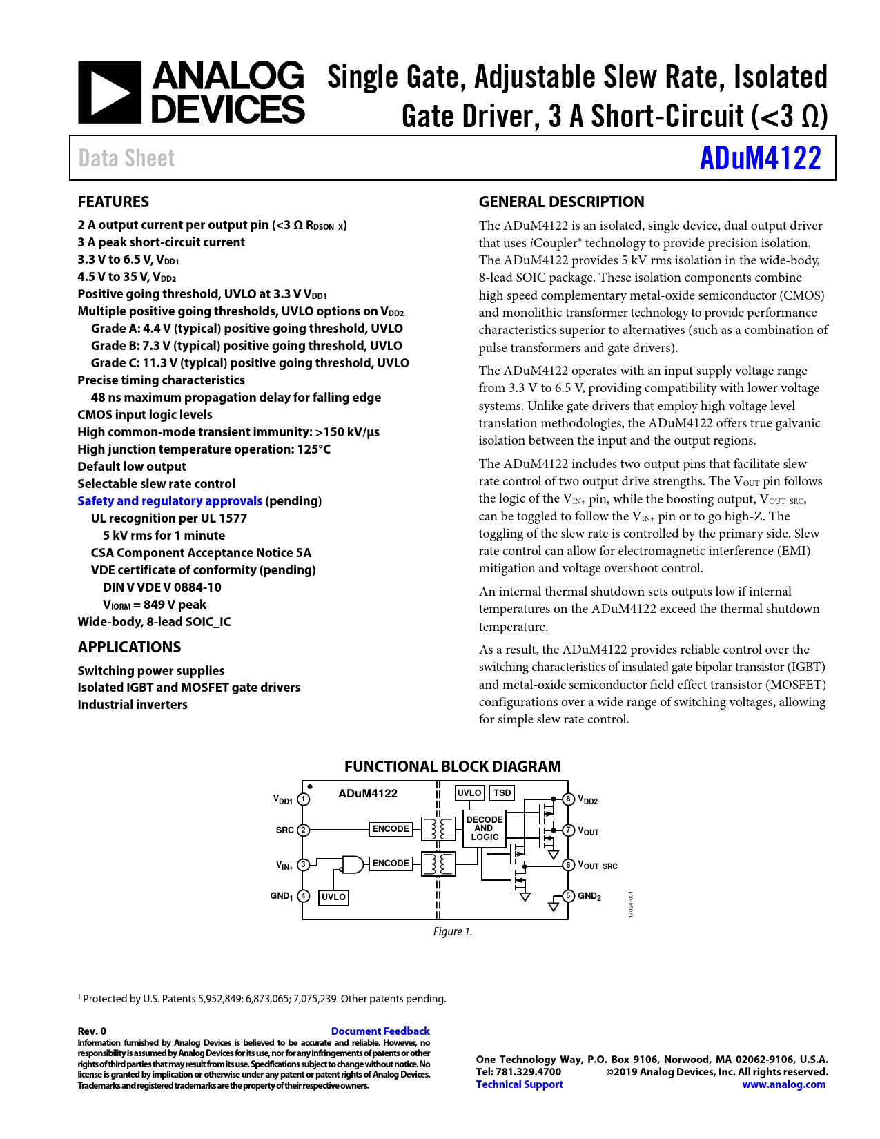 Single Gate, Adjustable Slew Rate, Isolated. Gate Driver, 3 A Short-Circuit (<3 Ω). Data Sheet. ADuM4122. FEATURES
