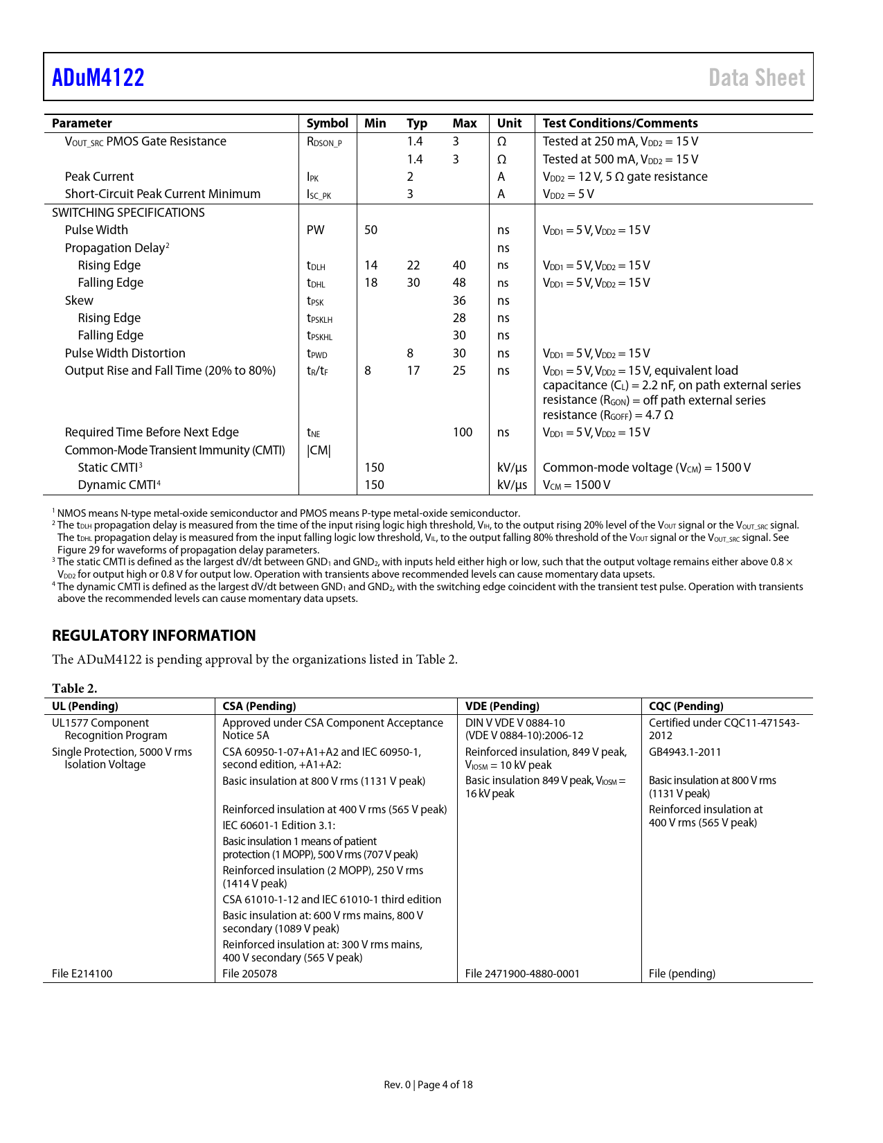 link to page 15 link to page 4 ADuM4122Data SheetParameterSymbol MinTypMaxUnitTest Conditions/Comments VOUT_SRC PMOS Gate Resistance RDSON_P 1.4 3 Ω Tested at 250 mA, VDD2 = 15 V 1.4 3 Ω Tested at 500 mA, VDD2 = 15 V Peak Current IPK 2 A VDD2 = 12 V, 5 Ω gate resistance Short-Circuit Peak Current Minimum ISC_PK 3 A VDD2 = 5 V SWITCHING SPECIFICATIONS Pulse Width PW 50 ns VDD1 = 5 V, VDD2 = 15 V Propagation Delay2 ns Rising Edge tDLH 14 22 40 ns VDD1 = 5 V, VDD2 = 15 V Falling Edge tDHL 18 30 48 ns VDD1 = 5 V, VDD2 = 15 V Skew tPSK 36 ns Rising Edge tPSKLH 28 ns Falling Edge tPSKHL 30 ns Pulse Width Distortion tPWD 8 30 ns VDD1 = 5 V, VDD2 = 15 V Output Rise and Fall Time (20% to 80%) tR/tF 8 17 25 ns VDD1 = 5 V, VDD2 = 15 V, equivalent load capacitance (CL) = 2.2 nF, on path external series resistance (RGON) = off path external series resistance (RGOFF) = 4.7 Ω Required Time Before Next Edge tNE 100 ns VDD1 = 5 V, VDD2 = 15 V Common-Mode Transient Immunity (CMTI) |CM| Static CMTI3 150 kV/µs Common-mode voltage (VCM) = 1500 V Dynamic CMTI4 150 kV/µs VCM = 1500 V 1 NMOS means N-type metal-oxide semiconductor and PMOS means P-type metal-oxide semiconductor. 2 The tDLH propagation delay is measured from the time of the input rising logic high threshold, VIH, to the output rising 20% level of the VOUT signal or the VOUT_SRC signal. The tDHL propagation delay is measured from the input falling logic low threshold, VIL, to the output falling 80% threshold of the VOUT signal or the VOUT_SRC signal. See Figure 29 for waveforms of propagation delay parameters. 3 The static CMTI is defined as the largest dV/dt between GND1 and GND2, with inputs held either high or low, such that the output voltage remains either above 0.8 × VDD2 for output high or 0.8 V for output low. Operation with transients above recommended levels can cause momentary data upsets. 4 The dynamic CMTI is defined as the largest dV/dt between GND1 and GND2, with the switching edge coincident with the transient test pulse. Operation with transients above the recommended levels can cause momentary data upsets. REGULATORY INFORMATION The ADuM4122 is pending approval by the organizations listed in Table 2. Table 2. UL (Pending)CSA (Pending)VDE (Pending)CQC (Pending) UL1577 Component Approved under CSA Component Acceptance DIN V VDE V 0884-10 Certified under CQC11-471543- Recognition Program Notice 5A (VDE V 0884-10):2006-12 2012 Single Protection, 5000 V rms CSA 60950-1-07+A1+A2 and IEC 60950-1, Reinforced insulation, 849 V peak, GB4943.1-2011 Isolation Voltage second edition, +A1+A2: VIOSM = 10 kV peak Basic insulation at 800 V rms (1131 V peak) Basic insulation 849 V peak, VIOSM = Basic insulation at 800 V rms 16 kV peak (1131 V peak) Reinforced insulation at 400 V rms (565 V peak) Reinforced insulation at 400 V rms (565 V peak) IEC 60601-1 Edition 3.1: Basic insulation 1 means of patient protection (1 MOPP), 500 V rms (707 V peak) Reinforced insulation (2 MOPP), 250 V rms (1414 V peak) CSA 61010-1-12 and IEC 61010-1 third edition Basic insulation at: 600 V rms mains, 800 V secondary (1089 V peak) Reinforced insulation at: 300 V rms mains, 400 V secondary (565 V peak) File E214100 File 205078 File 2471900-4880-0001 File (pending) Rev. 0 | Page 4 of 18 Document Outline Features Applications General Description Functional Block Diagram Revision History Specifications Electrical Specifications Regulatory Information Package Specifications Insulation and Safety Specifications DIN V VDE V 0884-10 (VDE V 0884-10) Insulation Characteristics Recommended Operating Conditions Absolute Maximum Ratings Thermal Resistance ESD Caution Pin Configuration and Function Descriptions Truth Table Typical Performance Characteristics Theory of Operation Applications Information PCB Layout Slew Rate Control Propagation Delay-Related Parameters Peak Current Rating Undervoltage Lockout Output Load Characteristics Power Dissipation Insulation Lifetime Typical Applications Outline Dimensions Ordering Guide