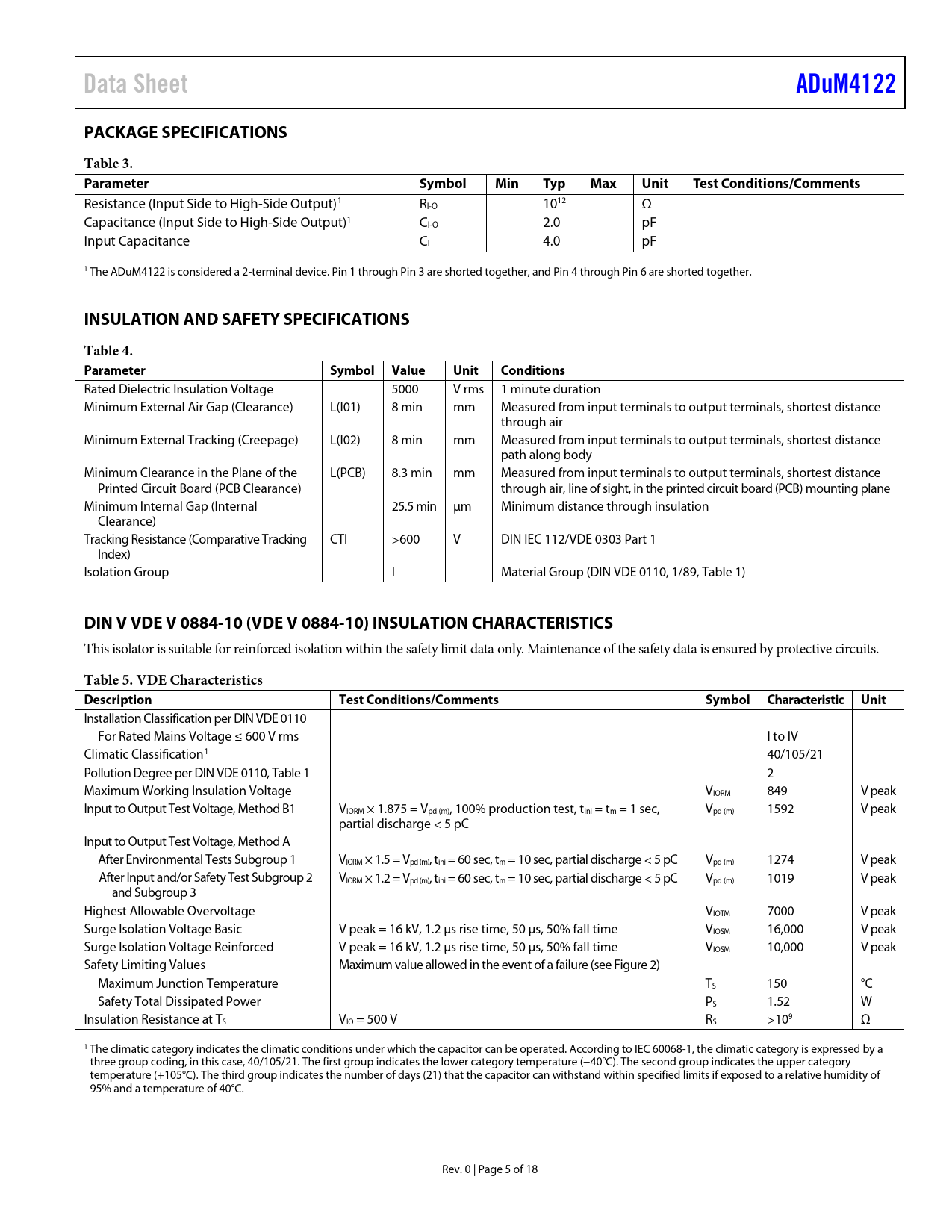Data Sheet. ADuM4122. PACKAGE SPECIFICATIONS. Table 3. Parameter. Symbol. Min. Typ. Max. Unit. Test Conditions/Comments