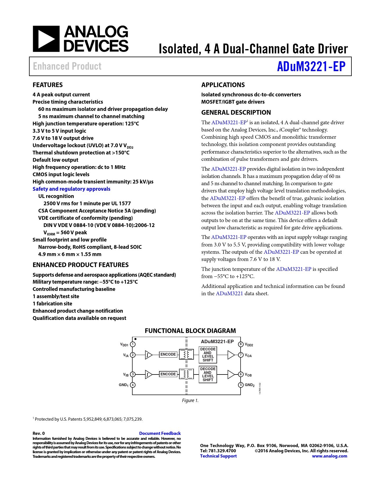Isolated, 4 A Dual-Channel Gate Driver Enhanced Product ADuM3221-EP FEATURES APPLICATIONS 4 A peak output current Isolated synchronous dc-to-dc converters Precise timing characteristics MOSFET/IGBT gate drivers 60 ns maximum isolator and driver propagation delay GENERAL DESCRIPTION 5 ns maximum channel to channel matching High junction temperature operation: 125°C
