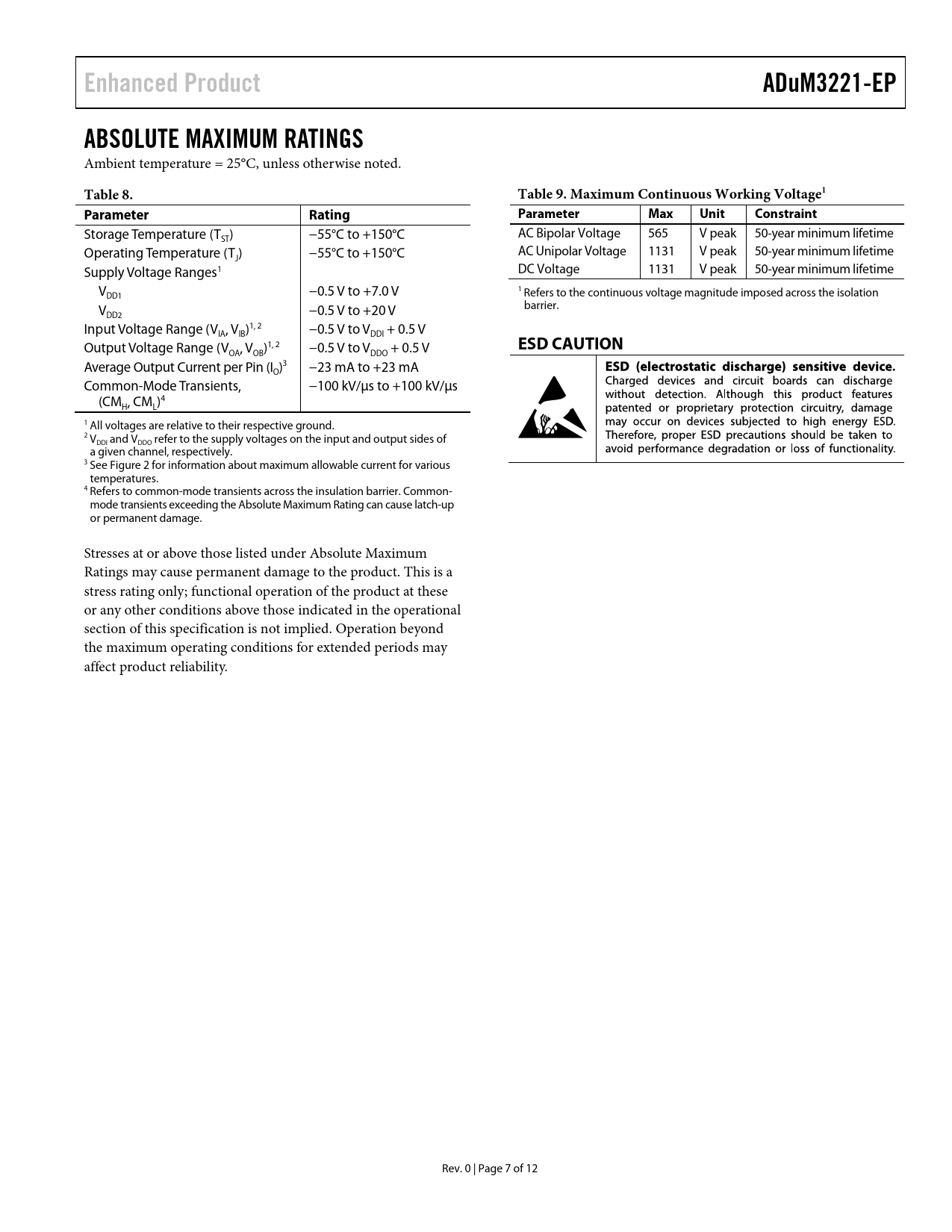 link to page 6 Enhanced ProductADuM3221-EPABSOLUTE MAXIMUM RATINGS Ambient temperature = 25°C, unless otherwise noted. Table 8.Table 9. Maximum Continuous Working Voltage1ParameterRatingParameterMaxUnitConstraint Storage Temperature (T ) −55°C to +150°C AC Bipolar Voltage 565 V peak 50-year minimum lifetime ST Operating Temperature (T ) −55°C to +150°C AC Unipolar Voltage 1131 V peak 50-year minimum lifetime J Supply Voltage Ranges1 DC Voltage 1131 V peak 50-year minimum lifetime V −0.5 V to +7.0 V 1 DD1 Refers to the continuous voltage magnitude imposed across the isolation V −0.5 V to +20 V barrier. DD2 Input Voltage Range (V , V )1, 2 −0.5 V to V + 0.5 V IA IB DDI Output Voltage Range (V , V )1, 2 −0.5 V to V + 0.5 V ESD CAUTION OA OB DDO Average Output Current per Pin (I )3 −23 mA to +23 mA O Common-Mode Transients, −100 kV/µs to +100 kV/µs (CM , CM )4 H L 1 All voltages are relative to their respective ground. 2 V DDI and VDDO refer to the supply voltages on the input and output sides of a given channel, respectively. 3 See Figure 2 for information about maximum allowable current for various temperatures. 4 Refers to common-mode transients across the insulation barrier. Common- mode transients exceeding the Absolute Maximum Rating can cause latch-up or permanent damage. Stresses at or above those listed under Absolute Maximum Ratings may cause permanent damage to the product. This is a stress rating only; functional operation of the product at these or any other conditions above those indicated in the operational section of this specification is not implied. Operation beyond the maximum operating conditions for extended periods may affect product reliability. Rev. 0 | Page 7 of 12 Document Outline FEATURES ENHANCED PRODUCT FEATURES APPLICATIONS GENERAL DESCRIPTION FUNCTIONAL BLOCK DIAGRAM TABLE OF CONTENTS REVISION HISTORY SPECIFICATIONS ELECTRICAL CHARACTERISTICS—5 V OPERATION ELECTRICAL CHARACTERISTICS—3.3 V OPERATION PACKAGE CHARACTERISTICS REGULATORY INFORMATION INSULATION AND SAFETY RELATED SPECIFICATIONS DIN V VDE V 0884-10 (VDE V 0884-10) INSULATION CHARACTERISTICS RECOMMENDED OPERATING CONDITIONS ABSOLUTE MAXIMUM RATINGS ESD CAUTION PIN CONFIGURATION AND FUNCTION DESCRIPTIONS TYPICAL PERFORMANCE CHARACTERISTICS OUTLINE DIMENSIONS ORDERING GUIDE