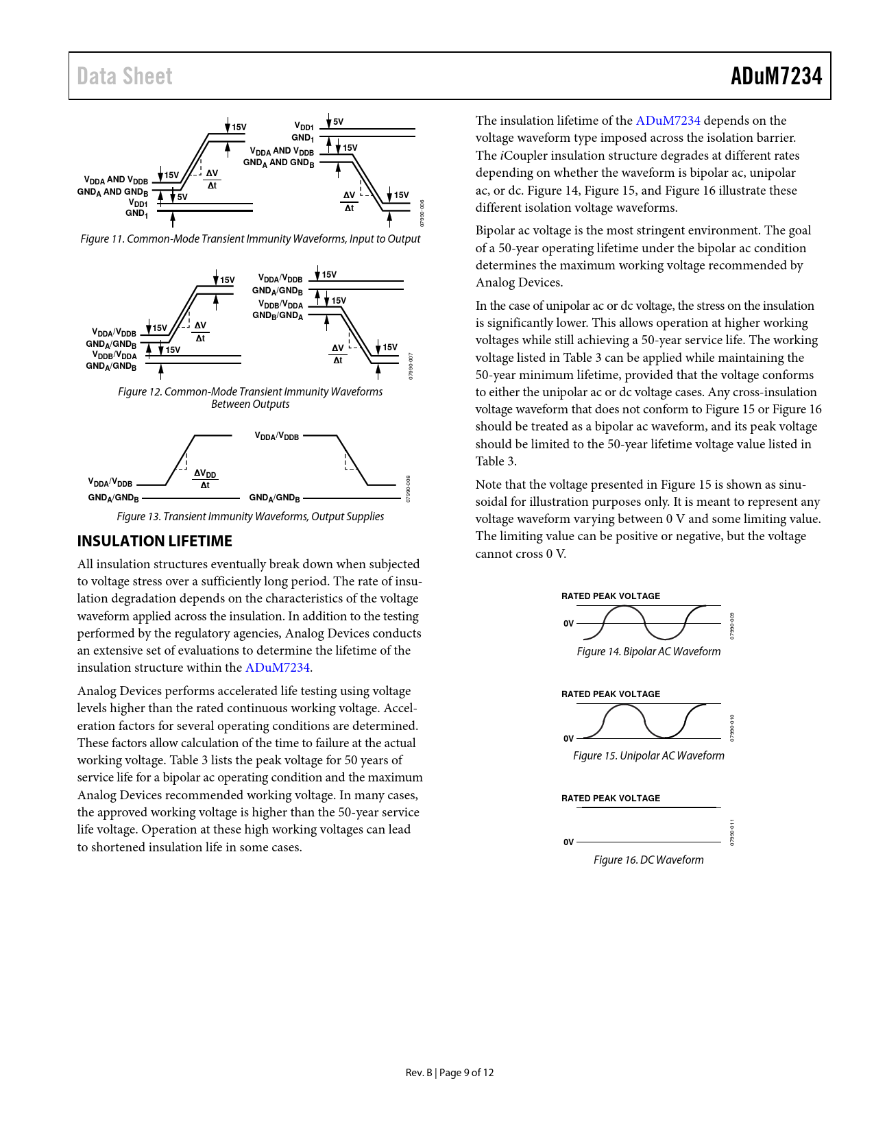 50-year minimum lifetime, provided that the voltage conforms 07990- Figure 12. Common-Mode Transient Immunity Waveforms to either the unipolar ac or dc voltage cases. Any cross-insulation Between Outputs voltage waveform that does not conform to Figure 15 or Figure 16 should be treated as a bipolar ac waveform, and its peak voltage