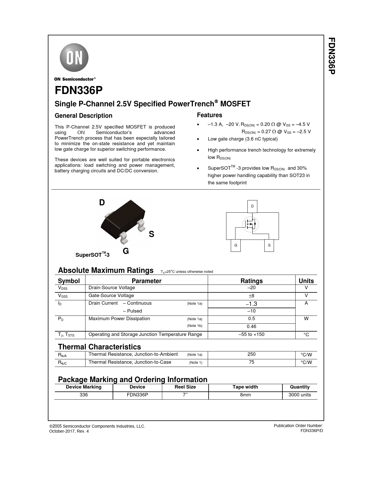 336 FDN336P 7’’ 8mm 3000 units ©2005 Semiconductor Components Industries, LLC. Publication Order Number: October-2017, Rev. 4 FDN336P/D