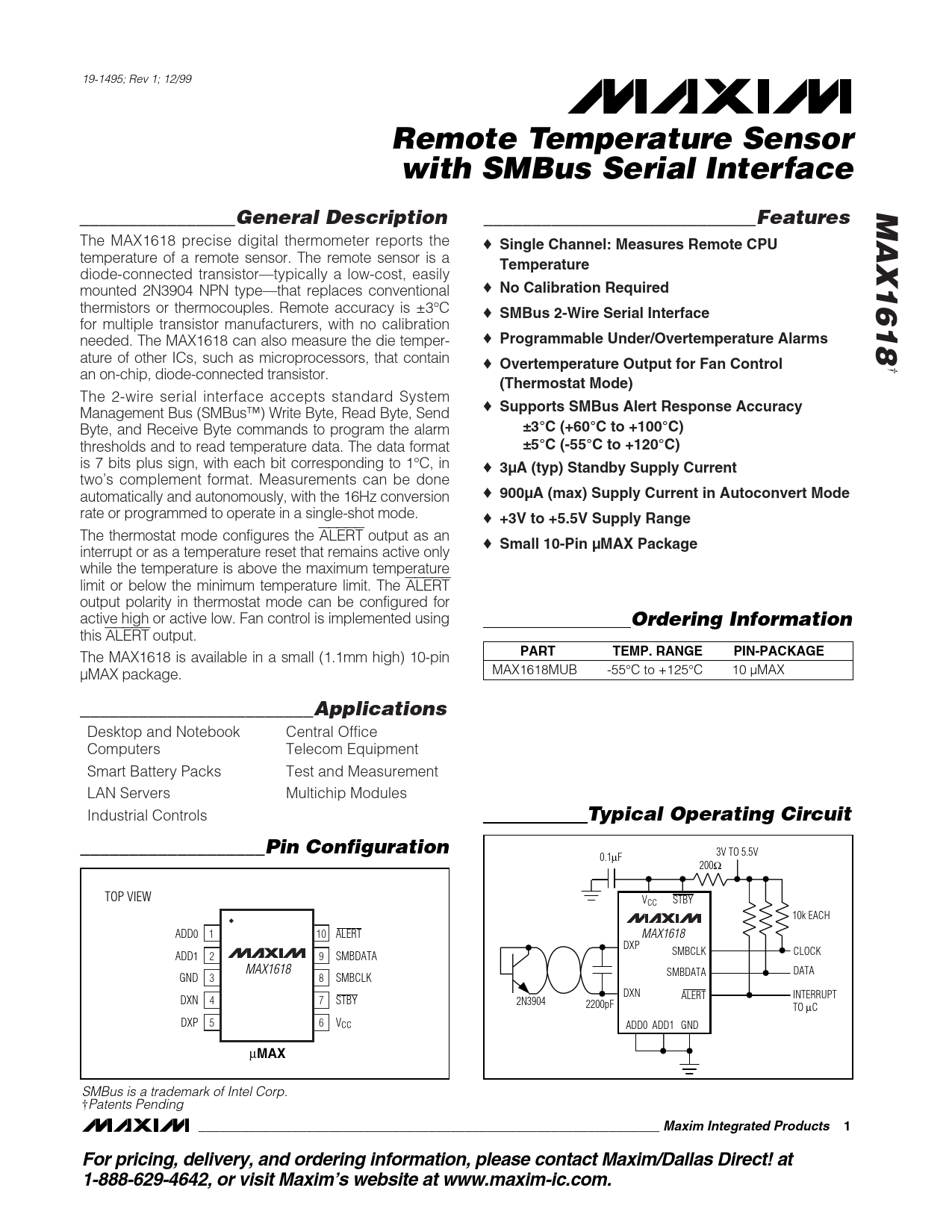 Remote Temperature Sensor. with SMBus Serial Interface. MAX1618. ________________General Description