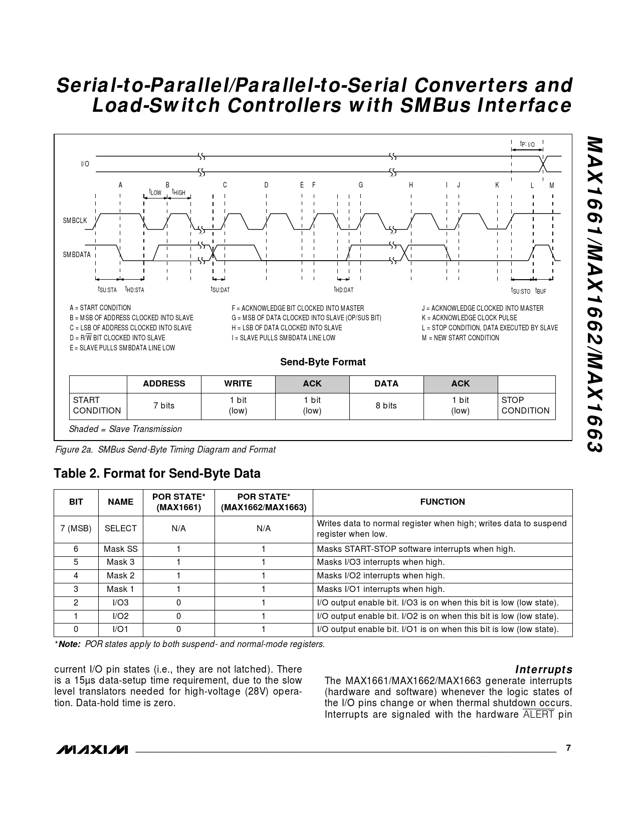 Serial-to-Parallel/Parallel-to-Serial Converters andLoad-Switch Controllers with SMBus InterfaceMAX1661/MAX1662/MAX1663 tP: I/O I/O A B C D E F G H I J K L M tLOW tHIGH SMBCLK SMBDATA tSU:STA tHD:STA tSU:DAT tHD:DAT tSU:STO tBUF A = START CONDITION F = ACKNOWLEDGE BIT CLOCKED INTO MASTER J = ACKNOWLEDGE CLOCKED INTO MASTER B = MSB OF ADDRESS CLOCKED INTO SLAVE G = MSB OF DATA CLOCKED INTO SLAVE (OP/SUS BIT) K = ACKNOWLEDGE CLOCK PULSE C = LSB OF ADDRESS CLOCKED INTO SLAVE H = LSB OF DATA CLOCKED INTO SLAVE L = STOP CONDITION, DATA EXECUTED BY SLAVE D = R/W BIT CLOCKED INTO SLAVE I = SLAVE PULLS SMBDATA LINE LOW M = NEW START CONDITION E = SLAVE PULLS SMBDATA LINE LOW Send-Byte FormatADDRESSWRITEACKDATAACK START 1 bit 1 bit 1 bit STOP 7 bits 8 bits CONDITION (low) (low) (low) CONDITION Shaded = Slave Transmission Figure 2a. SMBus Send-Byte Timing Diagram and Format Table 2. Format for Send-Byte DataPOR STATE*POR STATE*BITNAMEFUNCTION(MAX1661)(MAX1662/MAX1663) Writes data to normal register when high; writes data to suspend 7 (MSB) SELECT N/A N/A register when low. 6 Mask SS 1 1 Masks START-STOP software interrupts when high. 5 Mask 3 1 1 Masks I/O3 interrupts when high. 4 Mask 2 1 1 Masks I/O2 interrupts when high. 3 Mask 1 1 1 Masks I/O1 interrupts when high. 2 I/O3 0 1 I/O output enable bit. I/O3 is on when this bit is low (low state). 1 I/O2 0 1 I/O output enable bit. I/O2 is on when this bit is low (low state). 0 I/O1 0 1 I/O output enable bit. I/O1 is on when this bit is low (low state). * Note: POR states apply to both suspend- and normal-mode registers. current I/O pin states (i.e., they are not latched). There Interrupts is a 15µs data-setup time requirement, due to the slow The MAX1661/MAX1662/MAX1663 generate interrupts level translators needed for high-voltage (28V) opera- (hardware and software) whenever the logic states of tion. Data-hold time is zero. the I/O pins change or when thermal shutdown occurs. Interrupts are signaled with the hardware ALERT pin _______________________________________________________________________________________7