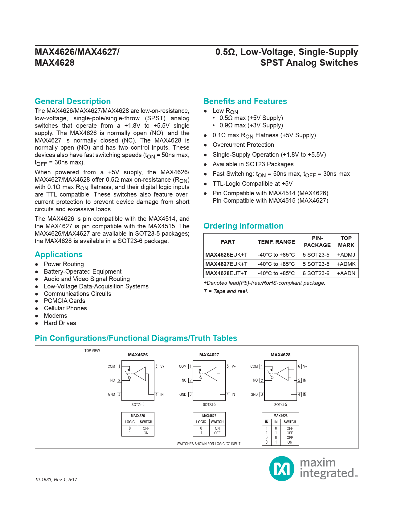 MAX4626/MAX4627/. 0.5Ω, Low-Voltage, Single-Supply. MAX4628. SPST Analog Switches. General Description. Benefits and Features