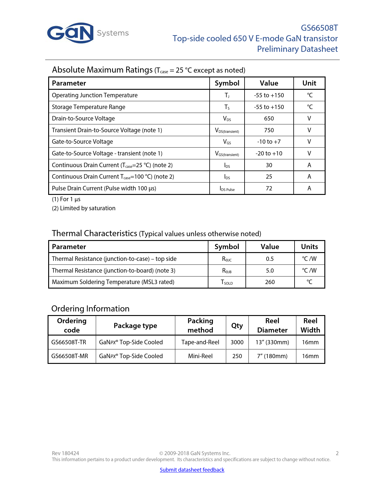 GS66508T-TR GaNPX® Top-Side Cooled Tape-and-Reel 3000 13” (330mm) 16mm GS66508T-MR GaNPX® Top-Side Cooled Mini-Reel 250 7” (180mm) 16mm Rev 180424 © 2009-2018 GaN Systems Inc. 2 This information pertains to a product under development. Its characteristics and specifications are subject to change without notice. Submit datasheet feedback