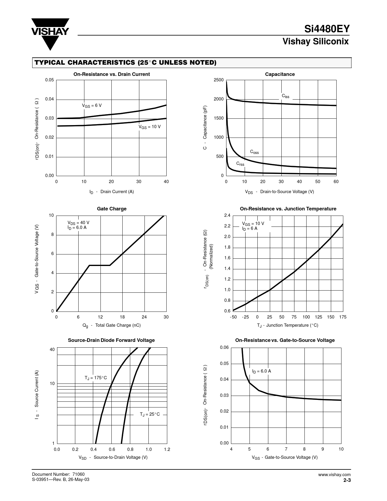 Si4480EY. Vishay Siliconix. On-Resistance vs. Drain Current. Capacitance. Gate Charge. On-Resistance vs. Junction Temperature