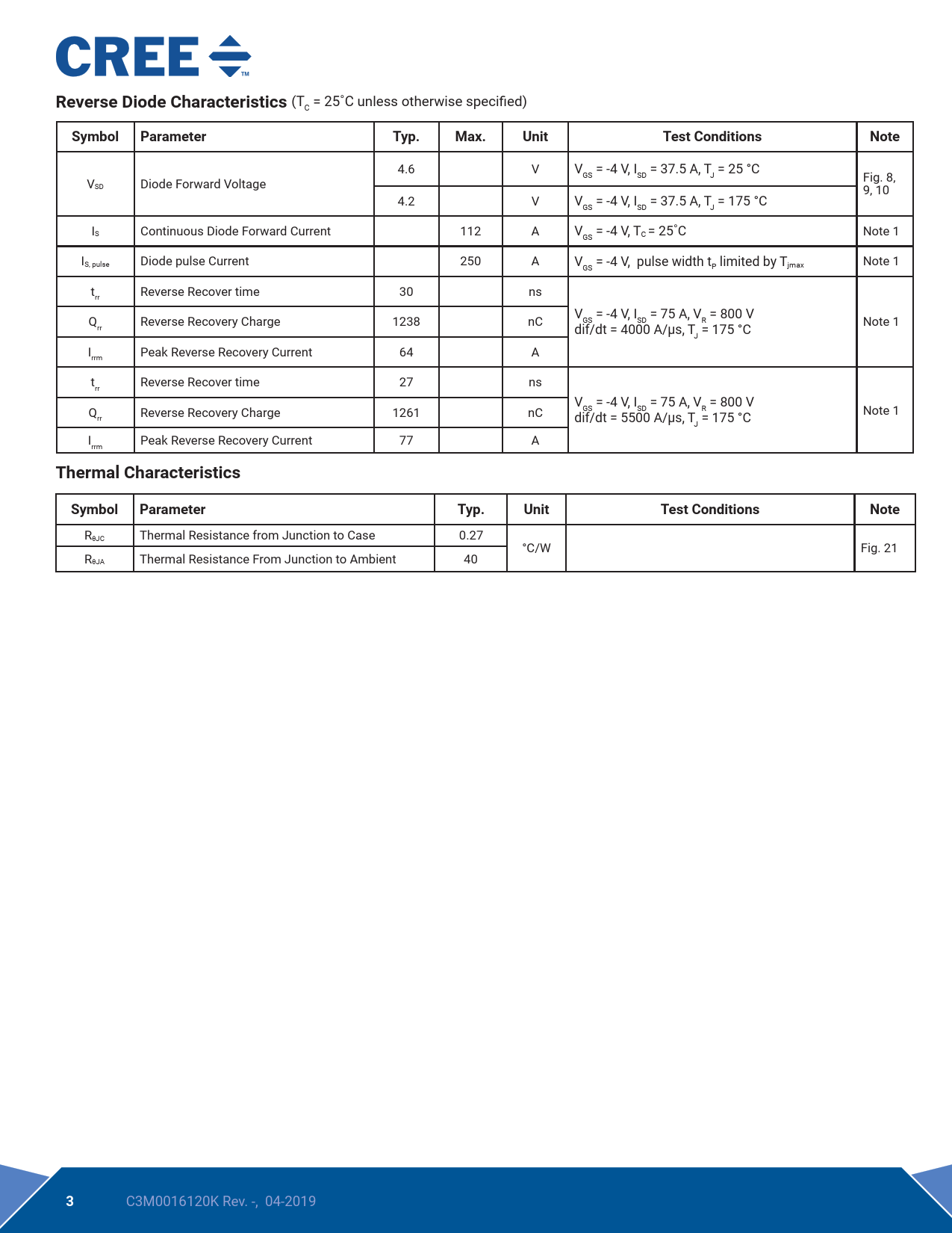Reverse Diode Characteristics (T = 25˚C unless otherwise specified) C SymbolParameterTyp.Max.UnitTest ConditionsNote 4.6 V V = -4 V, I = 37.5 A, T = 25 °C GS SD J V Fig. 8, SD Diode Forward Voltage 9, 10 4.2 V V = -4 V, I = 37.5 A, T = 175 °C GS SD J IS Continuous Diode Forward Current 112 A V = -4 V, T GS C = 25˚C Note 1 IS, pulse Diode pulse Current 250 A V = -4 V, pulse width t GS P limited by Tjmax Note 1 t Reverse Recover time 30 ns rr V = -4 V, I = 75 A, V = 800 V GS SD R Q Reverse Recovery Charge 1238 nC rr dif/dt = 4000 A/µs, T = 175 °C Note 1 J I Peak Reverse Recovery Current 64 A rrm t Reverse Recover time 27 ns rr V = -4 V, I = 75 A, V = 800 V GS SD R Q Reverse Recovery Charge 1261 nC rr dif/dt = 5500 A/µs, T = 175 °C Note 1 J I Peak Reverse Recovery Current 77 A rrm Thermal CharacteristicsSymbolParameterTyp.UnitTest ConditionsNote RθJC Thermal Resistance from Junction to Case 0.27 °C/W Fig. 21 RθJA Thermal Resistance From Junction to Ambient 40 3 C3M0016120K Rev. -, 04-2019