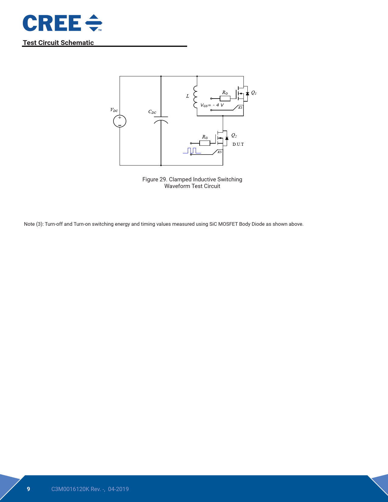 RG Q L 1 VGS= - 4 V V KS DC CDC Q2 RG D.U.T KS Figure 29. Clamped Inductive Switching Waveform Test Circuit Note (3): Turn-off and Turn-on switching energy and timing values measured using SiC MOSFET Body Diode as shown above.