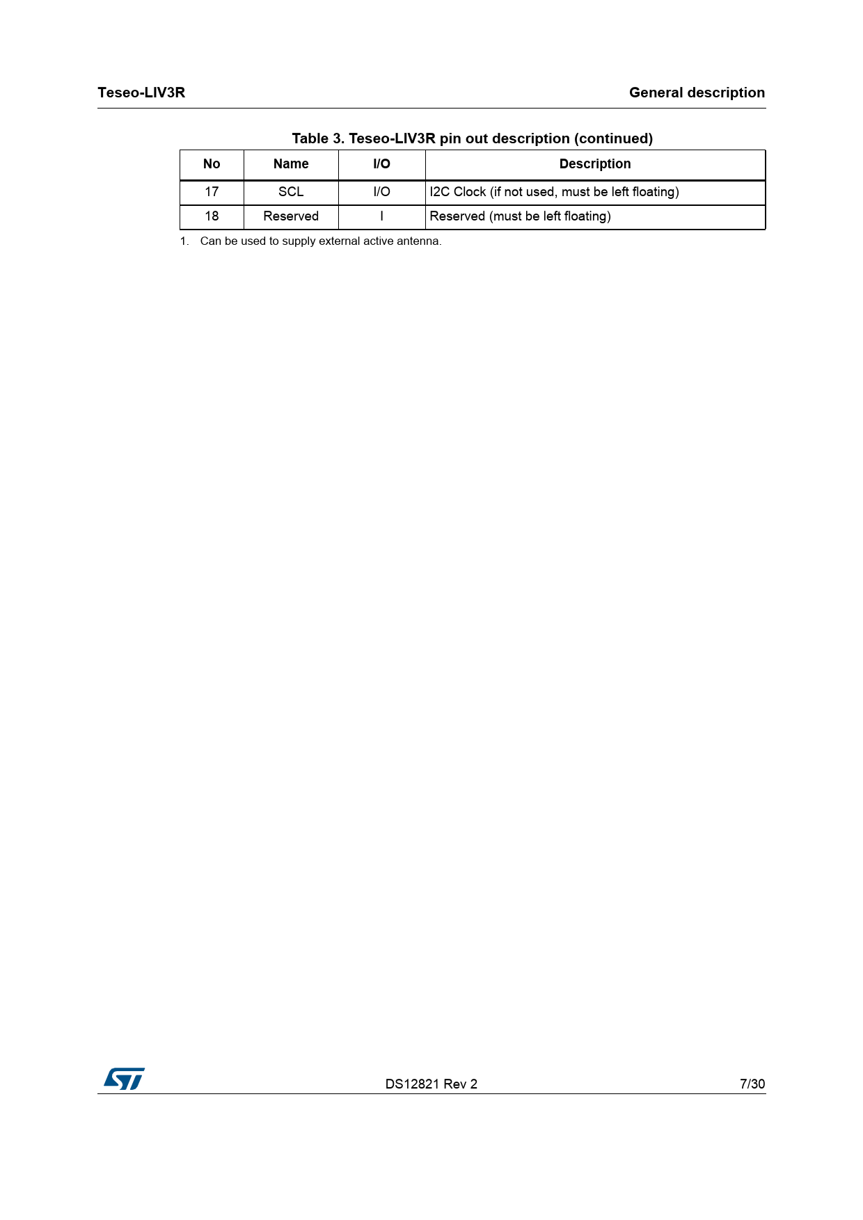 | 页数 / 页 | 30 / 7 — Teseo-LIV3R. General description. Table 3. Teseo-LIV3R pin out … |