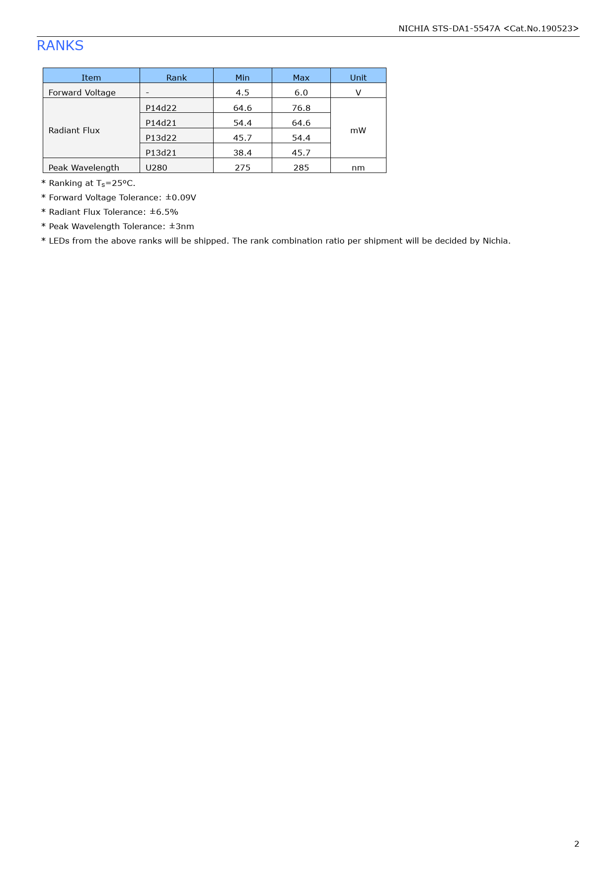 NICHIA STS-DA1-5547A RANKS Item Forward Voltage Radiant Flux Peak Wavelength Rank -Min Max Unit V 4.5 6.0 P14d22 64.6 76.8 P14d21 54.4 64.6 P13d22 45.7 54.4 P13d21 38.4 45.7 U280 275 285 mW nm * Ranking at TS=25°C. * Forward Voltage Tolerance: ±0.09V * Radiant Flux Tolerance: ±6.5% * Peak Wavelength Tolerance: ±3nm * LEDs from the above ranks will be shipped. The rank combination ratio per shipment will be decided by Nichia. 2