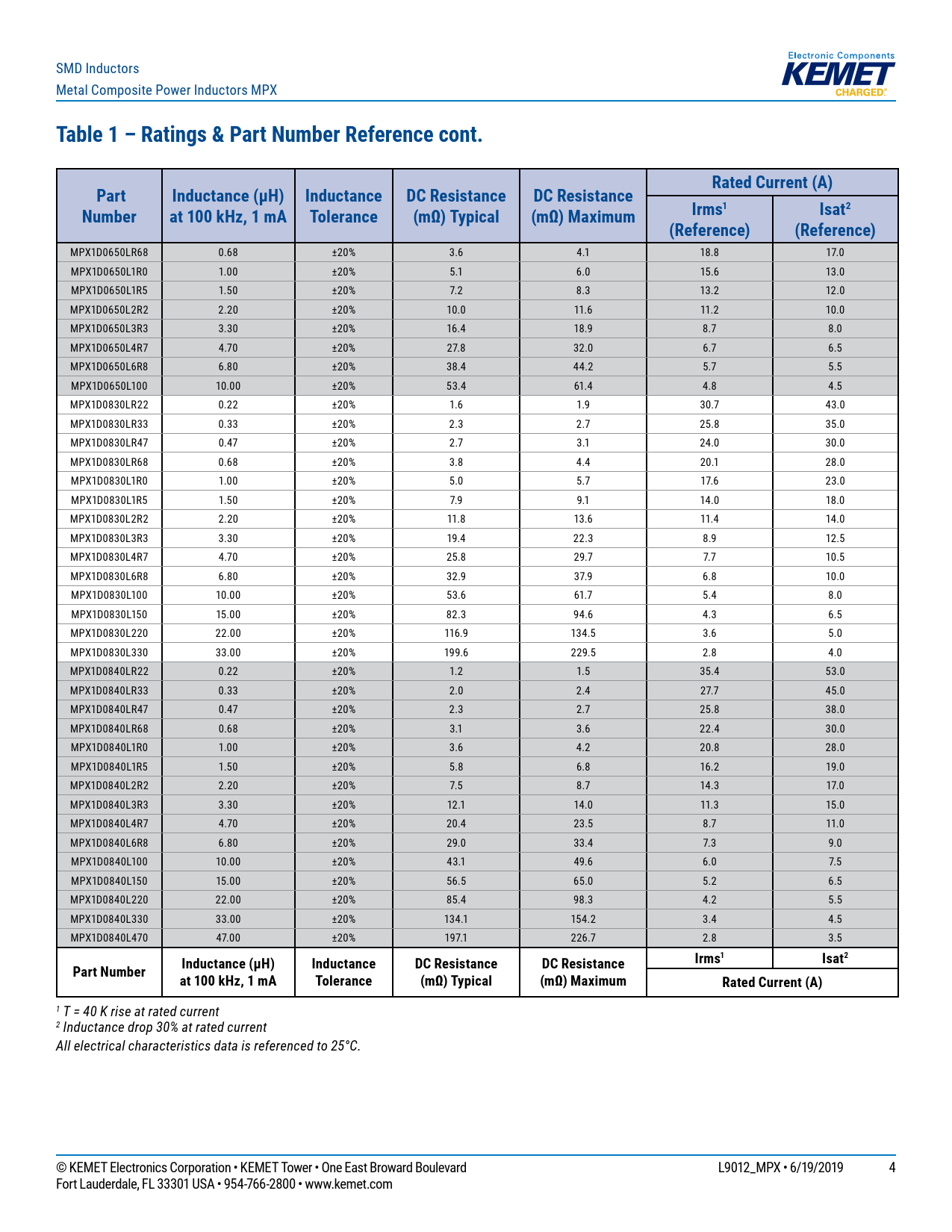 1 T = 40 K rise at rated current 2 Inductance drop 30% at rated current All electrical characteristics data is referenced to 25°C. © KEMET Electronics Corporation • KEMET Tower • One East Broward Boulevard L9012_MPX • 6/19/2019 4 Fort Lauderdale, FL 33301 USA • 954-766-2800 • www.kemet.com