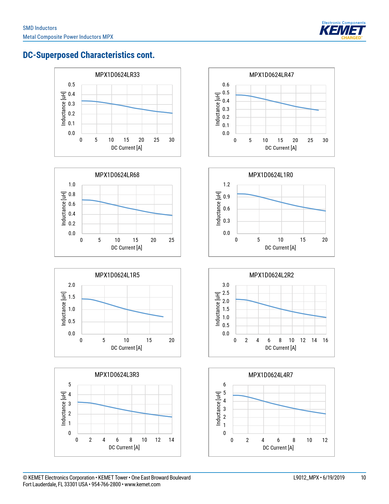 MPX1D0624LR33 MPX1D0624LR47 0.5 0.6 H] 0.4 0.5 H] 0.3 0.4 0.3 0.2 ductance [u 0.2 ductance [u In 0.1 In 0.1 0.0 0.0 0 5 10 15 20 25 30 0 5 10 15 20 25 30 DC Current [A] DC Current [A] MPX1D0624LR68 MPX1D0624L1R0 1.0 1.2 H] 0.8 H] 0.9 0.6 0.6 0.4 ductance [u ductance [u In 0.2 0.3 In 0.0 0.0 0 5 10 15 20 25 0 5 10 15 20 DC Current [A] DC Current [A] MPX1D0624L1R5 MPX1D0624L2R2 2.0 3.0 H] 2.5 1.5 H] 2.0 1.0 1.5 ductance [u 1.0 0.5 ductance [u In In 0.5 0.0 0.0 0 5 10 15 20 0 2 4 6 8 10 12 14 16 DC Current [A] DC Current [A] MPX1D0624L3R3 MPX1D0624L4R7 5 6 H] 4 5 H] 3 4 3 2 ductance [u 2 ductance [u In 1 In 1 0 0 0 2 4 6 8 10 12 14 0 2 4 6 8 10 12 DC Current [A] DC Current [A] © KEMET Electronics Corporation • KEMET Tower • One East Broward Boulevard L9012_MPX • 6/19/2019 10 Fort Lauderdale, FL 33301 USA • 954-766-2800 • www.kemet.com