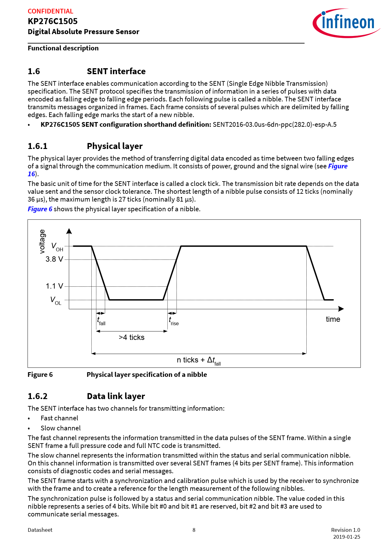 link to page 18 link to page 18 link to page 8 CONFIDENTIALKP276C1505Digital Absolute Pressure SensorFunctional description1.6SENT interface The SENT interface enables communication according to the SENT (Single Edge Nibble Transmission) specification. The SENT protocol specifies the transmission of information in a series of pulses with data encoded as falling edge to falling edge periods. Each following pulse is called a nibble. The SENT interface transmits messages organized in frames. Each frame consists of several pulses which are delimited by falling edges. Each falling edge marks the start of a new nibble. • KP276C1505 SENT configuration shorthand definition: SENT2016-03.0us-6dn-ppc(282.0)-esp-A.5 1.6.1Physical layer The physical layer provides the method of transferring digital data encoded as time between two falling edges of a signal through the communication medium. It consists of power, ground and the signal wire (see Figure16 ). The basic unit of time for the SENT interface is called a clock tick. The transmission bit rate depends on the data value sent and the sensor clock tolerance. The shortest length of a nibble pulse consists of 12 ticks (nominally 36 µs), the maximum length is 27 ticks (nominally 81 µs). Figure 6 shows the physical layer specification of a nibble. V voltage OH 3.8 V 1.1 V VOL t t time fall rise >4 ticks n ticks + Δtfall Figure 6Physical layer specification of a nibble1.6.2Data link layer The SENT interface has two channels for transmitting information: • Fast channel • Slow channel The fast channel represents the information transmitted in the data pulses of the SENT frame. Within a single SENT frame a full pressure code and full NTC code is transmitted. The slow channel represents the information transmitted within the status and serial communication nibble. On this channel information is transmitted over several SENT frames (4 bits per SENT frame). This information consists of diagnostic codes and serial messages. The SENT frame starts with a synchronization and calibration pulse which is used by the receiver to synchronize with the frame and to create a reference for the length measurement of the following nibbles. The synchronization pulse is followed by a status and serial communication nibble. The value coded in this nibble represents a series of 4 bits. While bit #0 and bit #1 are reserved, bit #2 and bit #3 are used to communicate serial messages. Datasheet 8 Revision 1.0 2019-01-25 Document Outline dTurboTMAP with SENT Output and Temperature Sensor Interface Features Potential applications Product validation Description Table of contents 1 Functional description 1.1 Pin configuration 1.2 Pin description 1.3 Block Diagram 1.4 Transfer function pressure 1.4.1 Pressure transfer function characteristics 1.4.2 Pressure accuracy 1.5 Transfer function temperature 1.5.1 Temperature transfer function characteristics 1.6 SENT interface 1.6.1 Physical layer 1.6.2 Data link layer 1.6.2.1 Nibble specification 1.6.2.2 Status and communication nibble 1.6.2.3 Enhanced serial message format 1.6.2.4 Enhanced serial message data 1.6.3 Pressure channel output codes 1.6.4 Temperature channel output codes 1.6.5 Diagnostic Error Codes 1.6.5.1 Signal out of range 1.6.5.2 Diag1 1.6.5.3 Diag2 1.6.5.4 EEPROM Check 1.6.6 Definition of Pressure signal path latency 1.7 External temperature sensor 1.7.1 Linearization of the external temperature sensor transfer function 1.7.2 Accuracy for NTC signal processing 2 Specification 2.1 Application circuit example 2.2 Application circuit example for EMC 2.3 Absolute maximum ratings 2.4 Operating range 2.5 Characteristics 3 Package information 3.1 PG-DSOF-8-162 Outline 3.2 Identification code Revision history Disclaimer