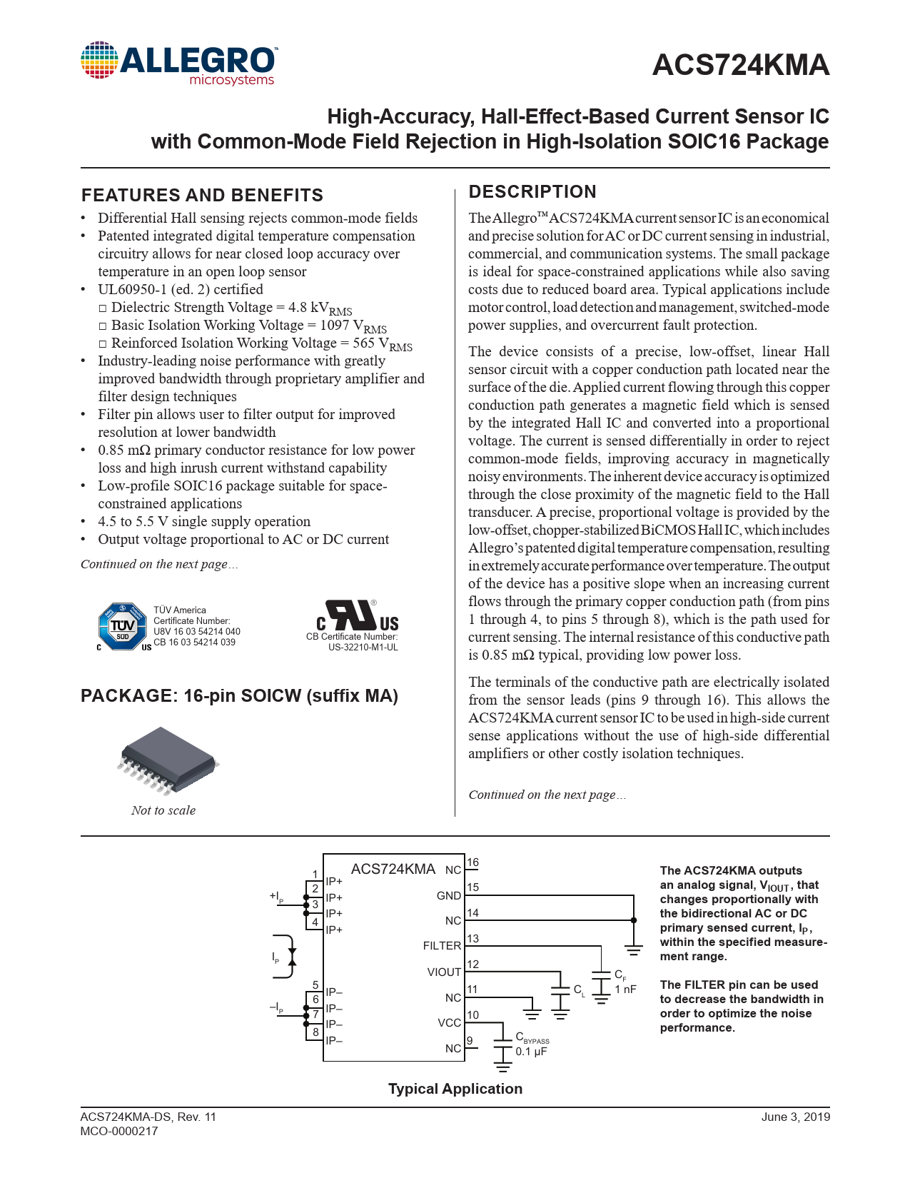 ACS724KMAHigh-Accuracy, Hall-Effect-Based Current Sensor ICwith Common-Mode Field Rejection in High-Isolation SOIC16 PackageFEATURES AND BENEFITSDESCRIPTION • Differential Hall sensing rejects common-mode fields The Allegro™ ACS724KMA current sensor IC is an economical • Patented integrated digital temperature compensation and precise solution for AC or DC current sensing in industrial, circuitry allows for near closed loop accuracy over commercial, and communication systems. The small package temperature in an open loop sensor is ideal for space-constrained applications while also saving • UL60950-1 (ed. 2) certified costs due to reduced board area. Typical applications include □ Dielectric Strength Voltage = 4.8 kVRMS motor control, load detection and management, switched-mode □ Basic Isolation Working Voltage = 1097 VRMS power supplies, and overcurrent fault protection. □ Reinforced Isolation Working Voltage = 565 VRMS The device consists of a precise, low-offset, linear Hall • Industry-leading noise performance with greatly sensor circuit with a copper conduction path located near the improved bandwidth through proprietary amplifier and surface of the die. Applied current flowing through this copper filter design techniques conduction path generates a magnetic field which is sensed • Filter pin allows user to filter output for improved by the integrated Hall IC and converted into a proportional resolution at lower bandwidth voltage. The current is sensed differentially in order to reject • 0.85 mΩ primary conductor resistance for low power common-mode fields, improving accuracy in magnetically loss and high inrush current withstand capability noisy environments. The inherent device accuracy is optimized • Low-profile SOIC16 package suitable for space- through the close proximity of the magnetic field to the Hall constrained applications transducer. A precise, proportional voltage is provided by the • 4.5 to 5.5 V single supply operation low-offset, chopper-stabilized BiCMOS Hal IC, which includes • Output voltage proportional to AC or DC current Allegro’s patented digital temperature compensation, resulting Continued on the next page… in extremely accurate performance over temperature. The output of the device has a positive slope when an increasing current flows through the primary copper conduction path (from pins TÜV America Certificate Number: 1 through 4, to pins 5 through 8), which is the path used for U8V 16 03 54214 040 CB Certificate Number: CB 16 03 54214 039 current sensing. The internal resistance of this conductive path US-32210-M1-UL is 0.85 mΩ typical, providing low power loss. The terminals of the conductive path are electrically isolated PACKAGE: 16-pin SOICW (suffix MA) from the sensor leads (pins 9 through 16). This allows the ACS724KMA current sensor IC to be used in high-side current sense applications without the use of high-side differential amplifiers or other costly isolation techniques. Continued on the next page… Not to scale 16 1 ACS724KMA NC The ACS724KMA outputs 2 IP+ 15 an analog signal, V +I GND IOUT , that P 3 IP+ changes proportionally with IP+ 14 the bidirectional AC or DC 4 NC IP+ primary sensed current, IP , FILTER 13 within the specified measure- I ment range. P 12 VIOUT C 5 F IP– 11 C 1 nF The FILTER pin can be used 6 L NC to decrease the bandwidth in –IP 7 IP– 10 order to optimize the noise IP– VCC 8 performance. C IP– 9 BYPASS NC 0.1 µF Typical Application ACS724KMA-DS, Rev. 11 June 3, 2019 MCO-0000217