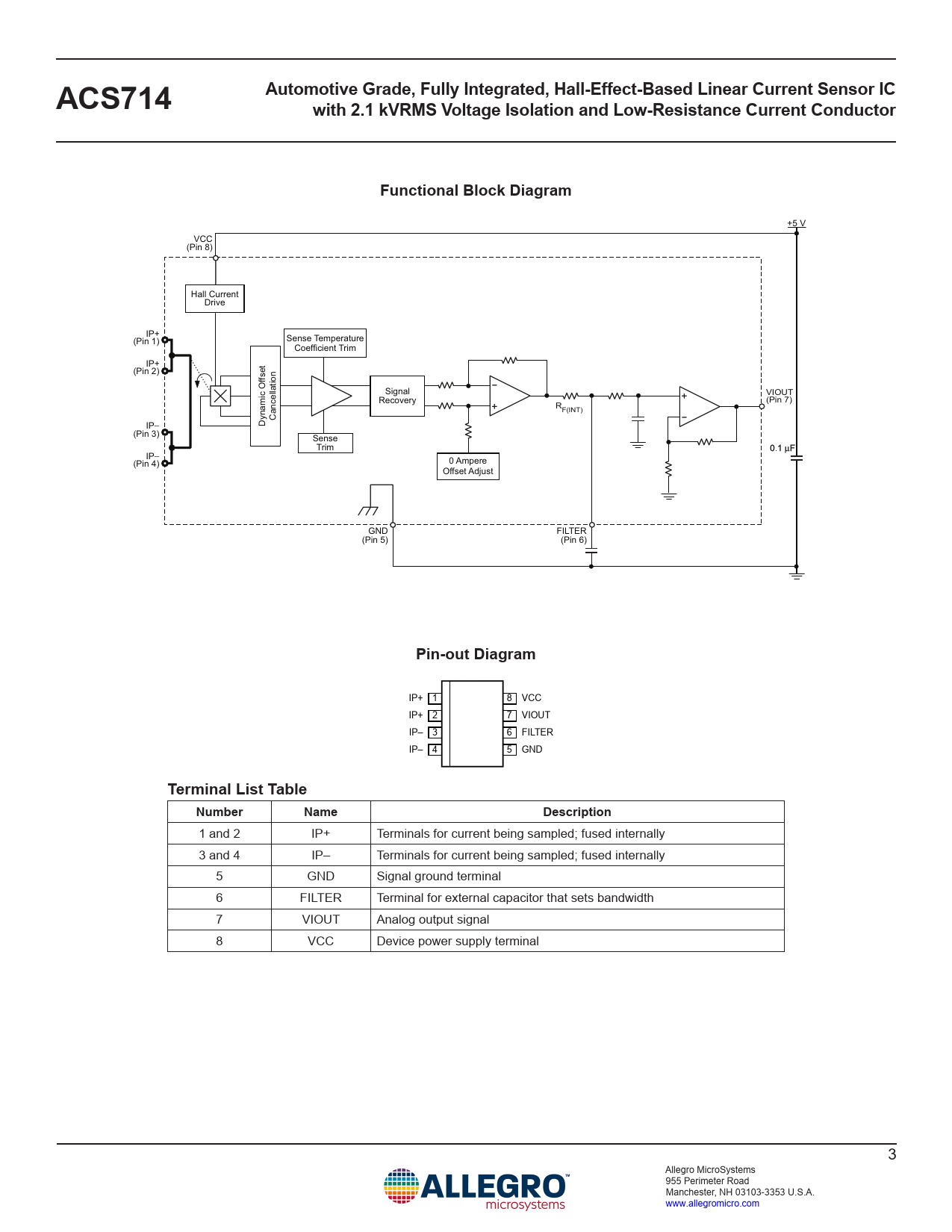 1 and 2 IP+ Terminals for current being sampled; fused internally 3 and 4 IP– Terminals for current being sampled; fused internally 5 GND Signal ground terminal 6 FILTER Terminal for external capacitor that sets bandwidth 7 VIOUT Analog output signal 8 VCC Device power supply terminal 3 Allegro MicroSystems 955 Perimeter Road Manchester, NH 03103-3353 U.S.A. www.allegromicro.com