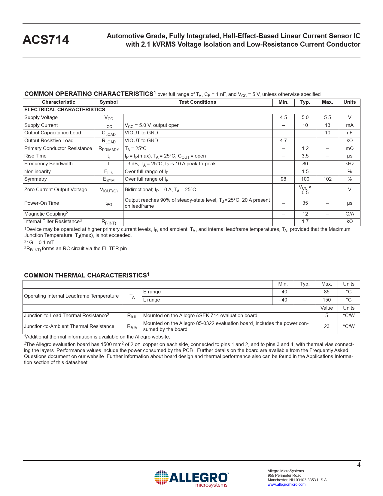 Automotive Grade, Fully Integrated, Hall-Effect-Based Linear Current Sensor ICACS714with 2.1 kVRMS Voltage Isolation and Low-Resistance Current ConductorCOMMON OPERATING CHARACTERISTICS1 over full range of TA , CF = 1 nF, and VCC = 5 V, unless otherwise specified CharacteristicSymbolTest ConditionsMin.Typ.Max.UnitsELECTRICAL CHARACTERISTICS Supply Voltage VCC 4.5 5.0 5.5 V Supply Current ICC VCC = 5.0 V, output open – 10 13 mA Output Capacitance Load CLOAD VIOUT to GND – – 10 nF Output Resistive Load RLOAD VIOUT to GND 4.7 – – kΩ Primary Conductor Resistance RPRIMARY TA = 25°C – 1.2 – mΩ Rise Time tr IP = IP(max), TA = 25°C, COUT = open – 3.5 – μs Frequency Bandwidth f –3 dB, TA = 25°C; IP is 10 A peak-to-peak – 80 – kHz Nonlinearity ELIN Over full range of IP – 1.5 – % Symmetry ESYM Over full range of IP 98 100 102 % Zero Current Output Voltage VIOUT(Q) Bidirectional; IP = 0 A, TA = 25°C – VCC × 0.5 – V Power-On Time t Output reaches 90% of steady-state level, TJ = 25°C, 20 A present PO on leadframe – 35 – µs Magnetic Coupling2 – 12 – G/A Internal Filter Resistance3 RF(INT) 1.7 kΩ 1Device may be operated at higher primary current levels, IP, and ambient, TA , and internal leadframe temperatures, TA , provided that the Maximum Junction Temperature, TJ(max), is not exceeded. 21G = 0.1 mT. 3RF(INT) forms an RC circuit via the FILTER pin. COMMON THERMAL CHARACTERISTICS1 Min. Typ. Max. Units E range –40 – 85 °C Operating Internal Leadframe Temperature TA L range –40 – 150 °C Value Units Junction-to-Lead Thermal Resistance2 RθJL Mounted on the Allegro ASEK 714 evaluation board 5 °C/W Junction-to-Ambient Thermal Resistance R Mounted on the Allegro 85-0322 evaluation board, includes the power con- θJA sumed by the board 23 °C/W 1Additional thermal information is available on the Allegro website. 2The Allegro evaluation board has 1500 mm2 of 2 oz. copper on each side, connected to pins 1 and 2, and to pins 3 and 4, with thermal vias connect- ing the layers. Performance values include the power consumed by the PCB. Further details on the board are available from the Frequently Asked Questions document on our website. Further information about board design and thermal performance also can be found in the Applications Informa- tion section of this datasheet. 4 Allegro MicroSystems 955 Perimeter Road Manchester, NH 03103-3353 U.S.A. www.allegromicro.com