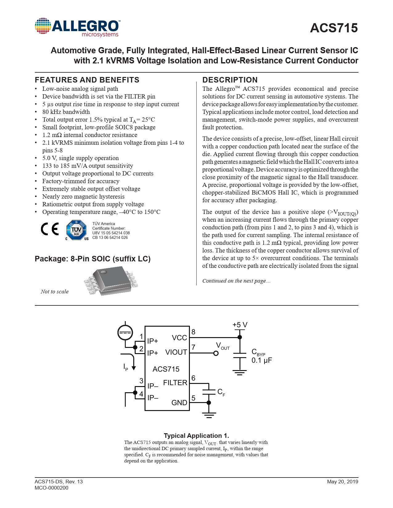 ACS715Automotive Grade, Fully Integrated, Hall-Effect-Based Linear Current Sensor ICwith 2.1 kVRMS Voltage Isolation and Low-Resistance Current ConductorFEATURES AND BENEFITSDESCRIPTION • Low-noise analog signal path The Allegro™ ACS715 provides economical and precise • Device bandwidth is set via the FILTER pin solutions for DC current sensing in automotive systems. The • 5 µs output rise time in response to step input current device package allows for easy implementation by the customer. • 80 kHz bandwidth Typical applications include motor control, load detection and • Total output error 1.5% typical at TA = 25°C management, switch-mode power supplies, and overcurrent • Small footprint, low-profile SOIC8 package fault protection. • 1.2 mΩ internal conductor resistance The device consists of a precise, low-offset, linear Hall circuit • 2.1 kVRMS minimum isolation voltage from pins 1-4 to with a copper conduction path located near the surface of the pins 5-8 die. Applied current flowing through this copper conduction • 5.0 V, single supply operation path generates a magnetic field which the Hall IC converts into a • 133 to 185 mV/A output sensitivity proportional voltage. Device accuracy is optimized through the • Output voltage proportional to DC currents close proximity of the magnetic signal to the Hall transducer. • Factory-trimmed for accuracy A precise, proportional voltage is provided by the low-offset, • Extremely stable output offset voltage chopper-stabilized BiCMOS Hall IC, which is programmed • Nearly zero magnetic hysteresis for accuracy after packaging. • Ratiometric output from supply voltage • Operating temperature range, –40°C to 150°C The output of the device has a positive slope (>VIOUT(Q)) when an increasing current flows through the primary copper TÜV America Certificate Number: conduction path (from pins 1 and 2, to pins 3 and 4), which is U8V 15 05 54214 038 the path used for current sampling. The internal resistance of CB 13 06 54214 026 this conductive path is 1.2 mΩ typical, providing low power loss. The thickness of the copper conductor allows survival of Package: 8-Pin SOIC (suffix LC) the device at up to 5× overcurrent conditions. The terminals of the conductive path are electrically isolated from the signal Continued on the next page… Not to scale +5 V 1 8 IP+ VCC 2 7 V IP+ VIOUT OUT CBYP 0.1 µF IP ACS715 3 6 IP– FILTER 4 C IP– 5 F GND Typical Application 1. The ACS715 outputs an analog signal, VOUT . that varies linearly with the unidirectional DC primary sampled current, IP , within the range specified. CF is recommended for noise management, with values that depend on the application. ACS715-DS, Rev. 13 May 20, 2019 MCO-0000200