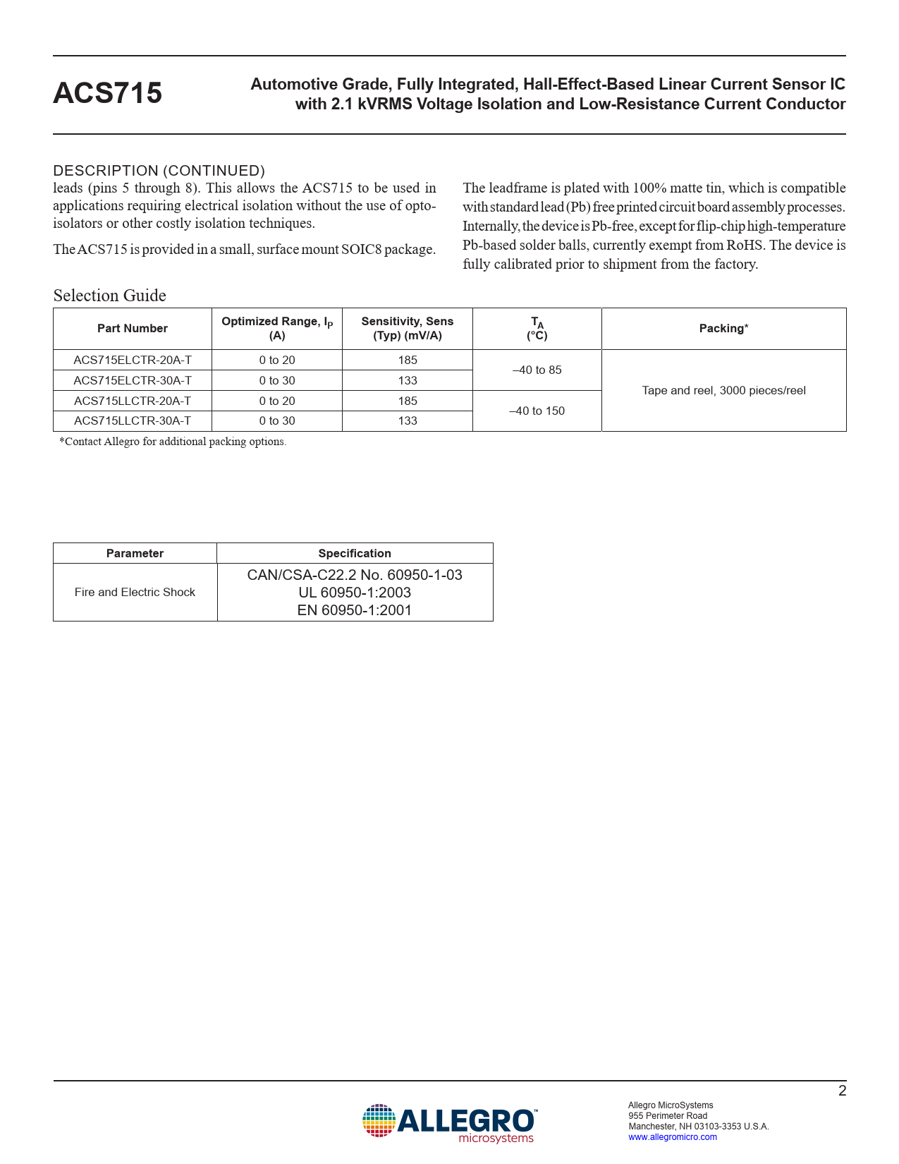 CAN/CSA-C22.2 No. 60950-1-03 Fire and Electric Shock UL 60950-1:2003 EN 60950-1:2001 2 Allegro MicroSystems 955 Perimeter Road Manchester, NH 03103-3353 U.S.A. www.allegromicro.com