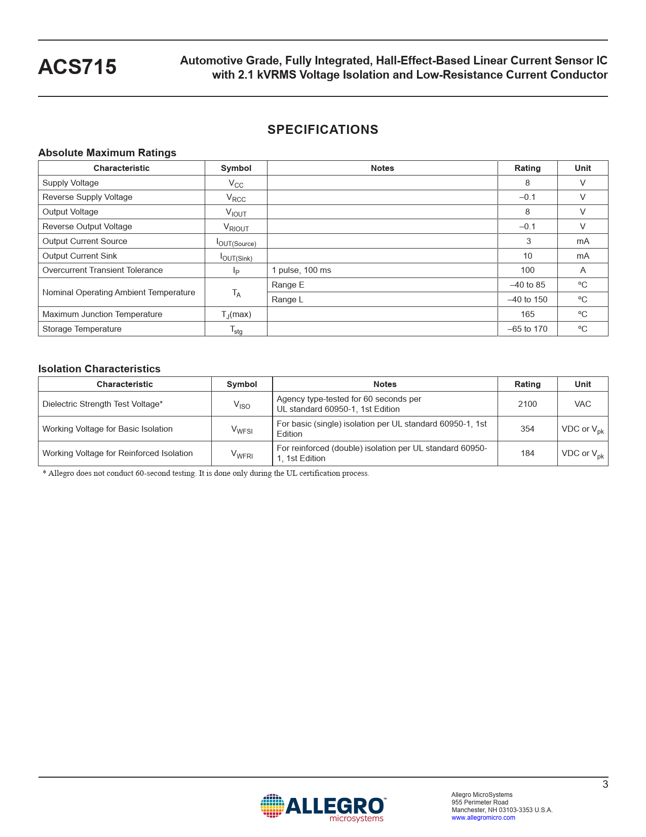 Automotive Grade, Fully Integrated, Hall-Effect-Based Linear Current Sensor IC ACS715 with 2.1 kVRMS Voltage Isolation and Low-Resistance Current Conductor SPECIFICATIONS Absolute Maximum Ratings Characteristic Symbol Notes Rating Unit