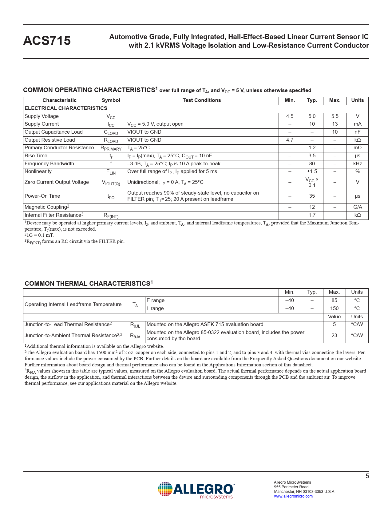Min. Typ. Max. Units E range –40 – 85 °C Operating Internal Leadframe Temperature TA L range –40 – 150 °C Value Units Junction-to-Lead Thermal Resistance2 RθJL Mounted on the Allegro ASEK 715 evaluation board 5 °C/W Junction-to-Ambient Thermal Resistance2,3 R Mounted on the Allegro 85-0322 evaluation board, includes the power θJA consumed by the board 23 °C/W 1Additional thermal information is available on the Allegro website. 2The Allegro evaluation board has 1500 mm2 of 2 oz. copper on each side, connected to pins 1 and 2, and to pins 3 and 4, with thermal vias connecting the layers. Per- formance values include the power consumed by the PCB. Further details on the board are available from the Frequently Asked Questions document on our website. Further information about board design and thermal performance also can be found in the Applications Information section of this datasheet. 3RθJA values shown in this table are typical values, measured on the Allegro evaluation board. The actual thermal performance depends on the actual application board design, the airflow in the application, and thermal interactions between the device and surrounding components through the PCB and the ambient air. To improve thermal performance, see our applications material on the Allegro website. 5 Allegro MicroSystems 955 Perimeter Road Manchester, NH 03103-3353 U.S.A. www.allegromicro.com