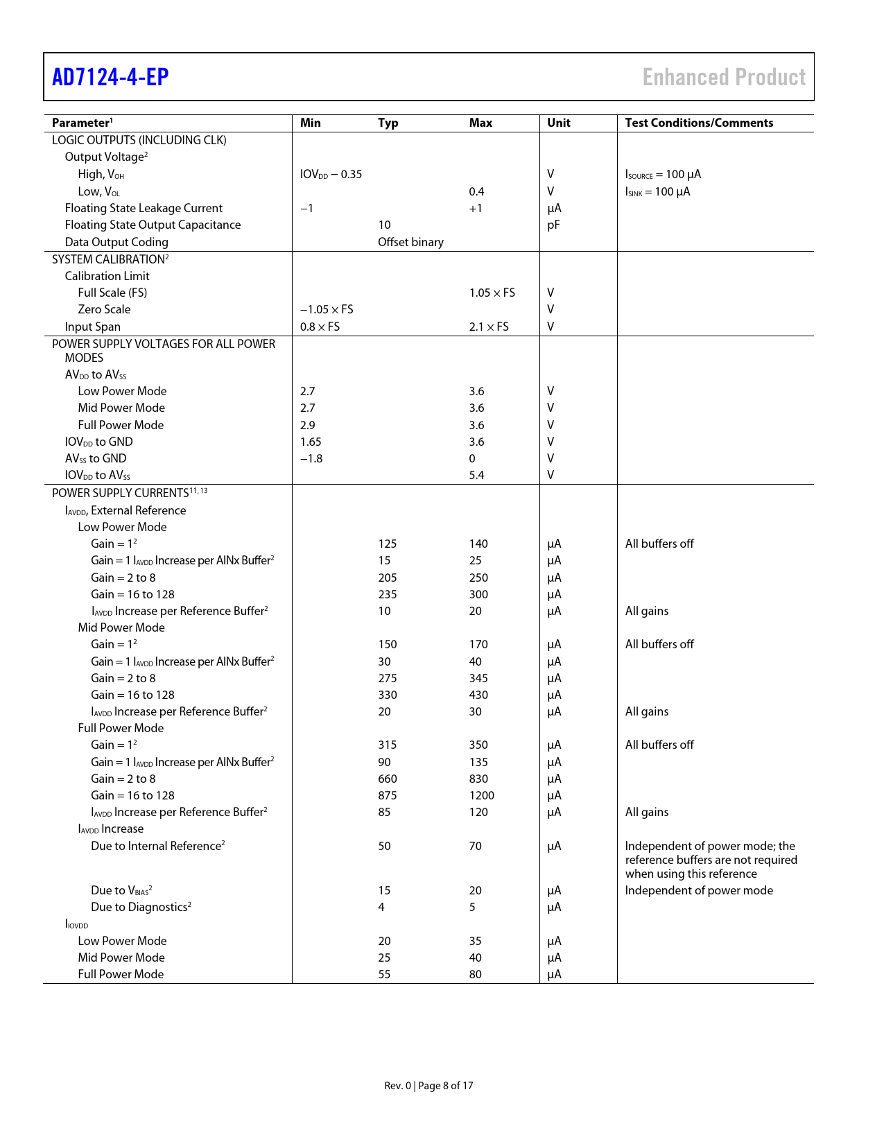 link to page 9 link to page 9 link to page 9 link to page 9 link to page 9 link to page 9 link to page 9 link to page 9 link to page 9 link to page 9 link to page 9 AD7124-4-EPEnhanced ProductParameter1 MinTypMaxUnitTestConditions/Comments LOGIC OUTPUTS (INCLUDING CLK) Output Voltage2 High, VOH IOVDD − 0.35 V ISOURCE = 100 μA Low, VOL 0.4 V ISINK = 100 μA Floating State Leakage Current −1 +1 μA Floating State Output Capacitance 10 pF Data Output Coding Offset binary SYSTEM CALIBRATION2 Calibration Limit Full Scale (FS) 1.05 × FS V Zero Scale −1.05 × FS V Input Span 0.8 × FS 2.1 × FS V POWER SUPPLY VOLTAGES FOR ALL POWER MODES AVDD to AVSS Low Power Mode 2.7 3.6 V Mid Power Mode 2.7 3.6 V Full Power Mode 2.9 3.6 V IOVDD to GND 1.65 3.6 V AVSS to GND −1.8 0 V IOVDD to AVSS 5.4 V POWER SUPPLY CURRENTS11, 13 IAVDD, External Reference Low Power Mode Gain = 12 125 140 μA All buffers off Gain = 1 IAVDD Increase per AINx Buffer2 15 25 μA Gain = 2 to 8 205 250 μA Gain = 16 to 128 235 300 μA IAVDD Increase per Reference Buffer2 10 20 μA All gains Mid Power Mode Gain = 12 150 170 μA All buffers off Gain = 1 IAVDD Increase per AINx Buffer2 30 40 μA Gain = 2 to 8 275 345 μA Gain = 16 to 128 330 430 μA IAVDD Increase per Reference Buffer2 20 30 μA All gains Full Power Mode Gain = 12 315 350 μA All buffers off Gain = 1 IAVDD Increase per AINx Buffer2 90 135 μA Gain = 2 to 8 660 830 μA Gain = 16 to 128 875 1200 μA IAVDD Increase per Reference Buffer2 85 120 μA All gains IAVDD Increase Due to Internal Reference2 50 70 μA Independent of power mode; the reference buffers are not required when using this reference Due to V 2 BIAS 15 20 μA Independent of power mode Due to Diagnostics2 4 5 μA IIOVDD Low Power Mode 20 35 μA Mid Power Mode 25 40 μA Full Power Mode 55 80 μA Rev. 0 | Page 8 of 17 Document Outline FEATURES ENHANCED PRODUCT FEATURES APPLICATIONS FUNCTIONAL BLOCK DIAGRAM TABLE OF CONTENTS REVISION HISTORY GENERAL DESCRIPTION SPECIFICATIONS ABSOLUTE MAXIMUM RATINGS THERMAL RESISTANCE ESD CAUTION PIN CONFIGURATION AND FUNCTION DESCRIPTIONS TYPICAL PERFORMANCE CHARACTERISTICS OUTLINE DIMENSIONS ORDERING GUIDE