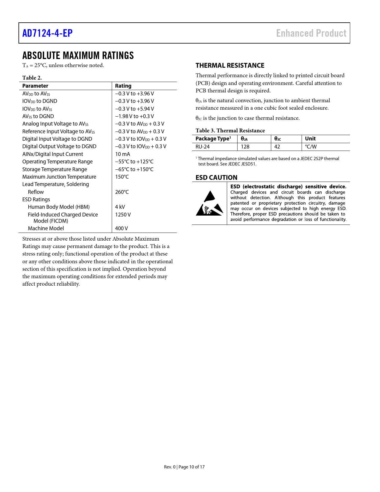 AD7124-4-EP. Enhanced Product. ABSOLUTE MAXIMUM RATINGS. THERMAL RESISTANCE. Table 2. Parameter. Rating. Table 3. Thermal Resistance