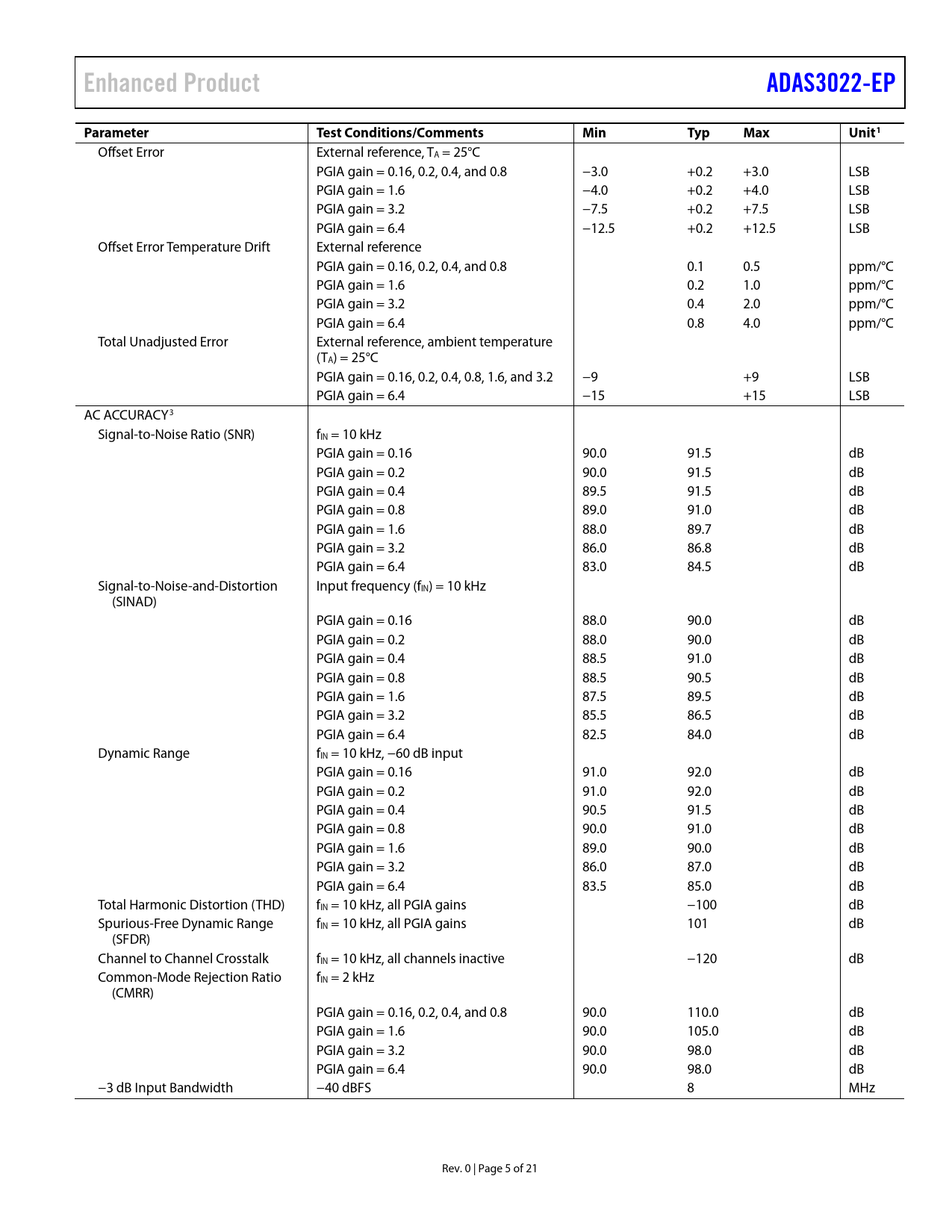 Enhanced Product. ADAS3022-EP. Parameter. Test Conditions/Comments. Min. Typ. Max. Unit1