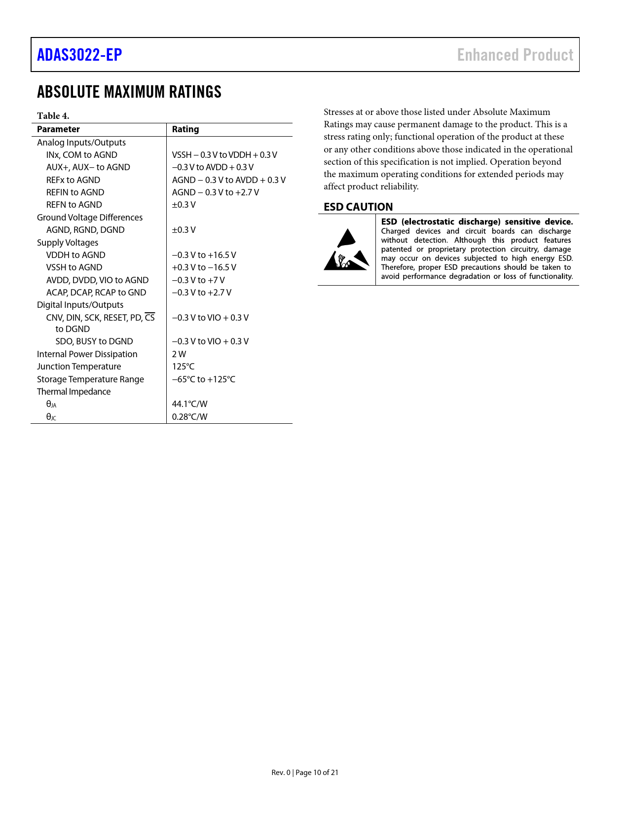 ADAS3022-EP. Enhanced Product. ABSOLUTE MAXIMUM RATINGS. Table 4. Parameter Rating. ESD CAUTION