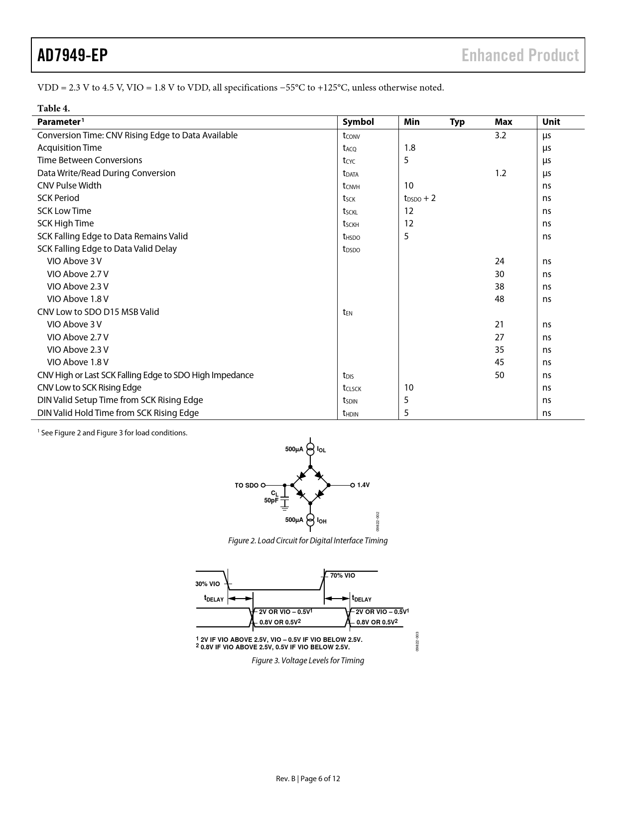 link to page 6 link to page 6 AD7949-EPEnhanced Product VDD = 2.3 V to 4.5 V, VIO = 1.8 V to VDD, all specifications −55°C to +125°C, unless otherwise noted. Table 4. Parameter1SymbolMinTypMaxUnit Conversion Time: CNV Rising Edge to Data Available tCONV 3.2 µs Acquisition Time tACQ 1.8 µs Time Between Conversions tCYC 5 µs Data Write/Read During Conversion tDATA 1.2 µs CNV Pulse Width tCNVH 10 ns SCK Period tSCK tDSDO + 2 ns SCK Low Time tSCKL 12 ns SCK High Time tSCKH 12 ns SCK Falling Edge to Data Remains Valid tHSDO 5 ns SCK Falling Edge to Data Valid Delay tDSDO VIO Above 3 V 24 ns VIO Above 2.7 V 30 ns VIO Above 2.3 V 38 ns VIO Above 1.8 V 48 ns CNV Low to SDO D15 MSB Valid tEN VIO Above 3 V 21 ns VIO Above 2.7 V 27 ns VIO Above 2.3 V 35 ns VIO Above 1.8 V 45 ns CNV High or Last SCK Fal ing Edge to SDO High Impedance tDIS 50 ns CNV Low to SCK Rising Edge tCLSCK 10 ns DIN Valid Setup Time from SCK Rising Edge tSDIN 5 ns DIN Valid Hold Time from SCK Rising Edge tHDIN 5 ns 1 See Figure 2 and Figure 3 for load conditions. 500µAIOLTO SDO1.4VCL50pF 002 500µAIOH 09822- Figure 2. Load Circuit for Digital Interface Timing 70% VIO30% VIOtDELAYtDELAY2V OR VIO – 0.5V12V OR VIO – 0.5V10.8V OR 0.5V20.8V OR 0.5V21 2V IF VIO ABOVE 2.5V, VIO – 0.5V IF VIO BELOW 2.5V. 003 2 0.8V IF VIO ABOVE 2.5V, 0.5V IF VIO BELOW 2.5V. 09822- Figure 3. Voltage Levels for Timing Rev. B | Page 6 of 12 Document Outline Features Applications Functional Block Diagram General Description Table of Contents Revision History Specifications Timing Specifications Absolute Maximum Ratings ESD Caution Pin Configuration and Function Descriptions Typical Performance Characteristics Outline Dimensions Ordering Guide