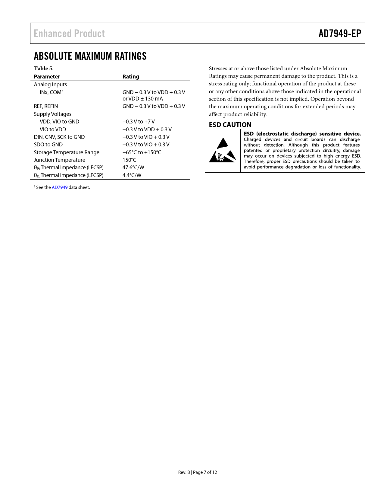 Enhanced Product AD7949-EP ABSOLUTE MAXIMUM RATINGS Table 5 Parameter Rating ESD CAUTION